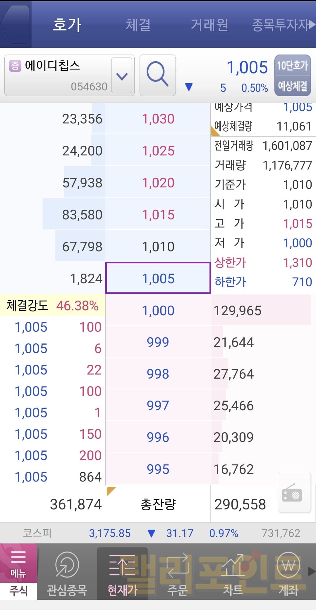 사진을 보면 위 에이디칩스 종목은 1,000원 아래 매수2호가를 보듯이 호가 단위가 1원이였습니다. 하지만 주가의 상승으로 주가가 1,000원을 돌파하면서 호가 단위가 5원으로 변경된 것을 확인할 수 있습니다.