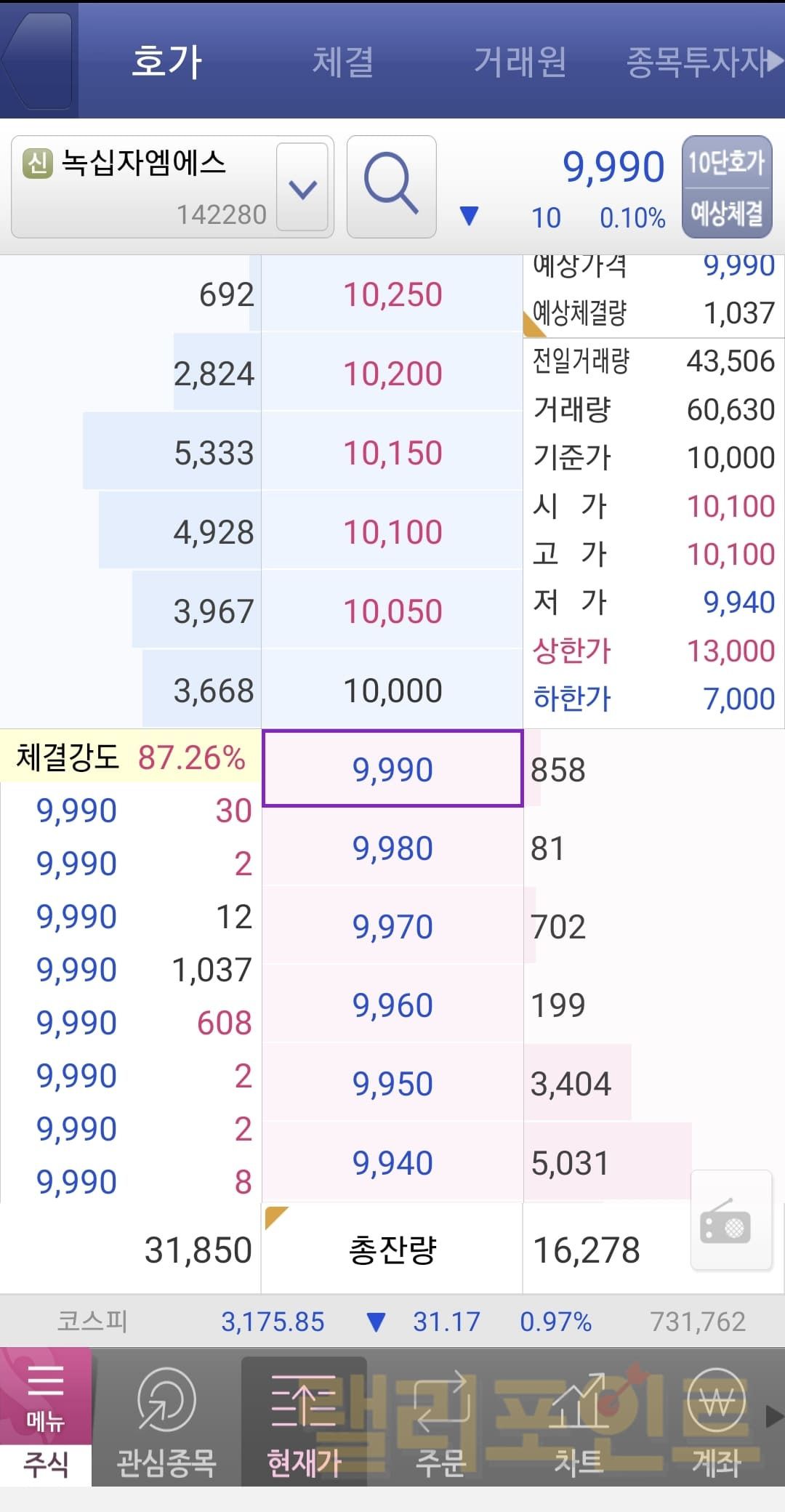 사진을 보면 위 녹십자엡에스 종목은 10,000원 아래 매수1호가를 보듯이 호가 단위가 10원이였습니다. 하지만 주가의 상승으로 주가가 10,000원을 돌파하면서 호가 단위가 50원으로 변경된 것을 확인할 수 있습니다.