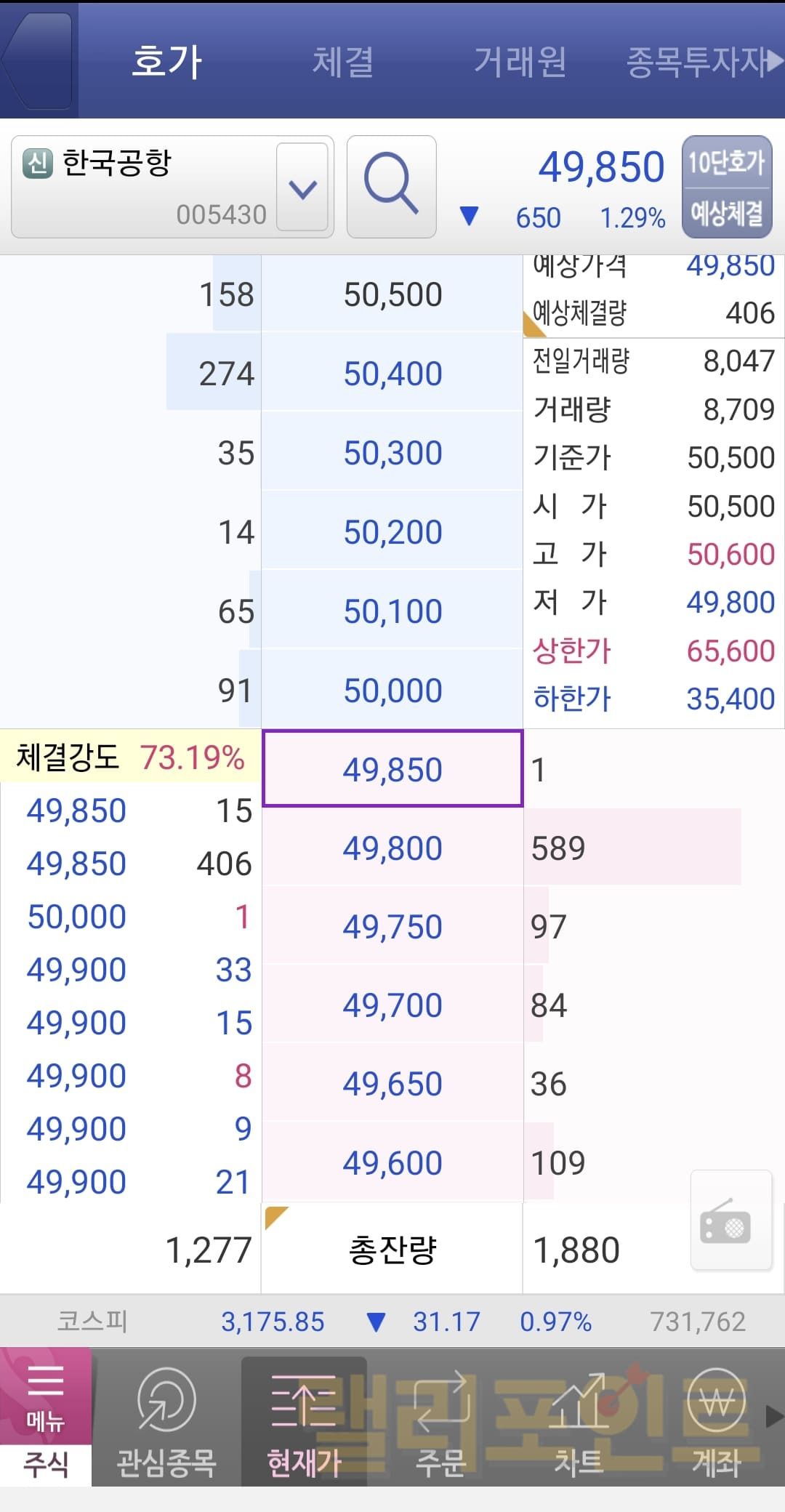 사진을 보면 위 한국공항 종목은 50,000원 아래 매수1호가를 보듯이 호가 단위가 50원이였습니다. 하지만 주가의 상승으로 주가가 1,000원을 돌파하면서 호가 단위가 100원으로 변경된 것을 확인할 수 있습니다.
