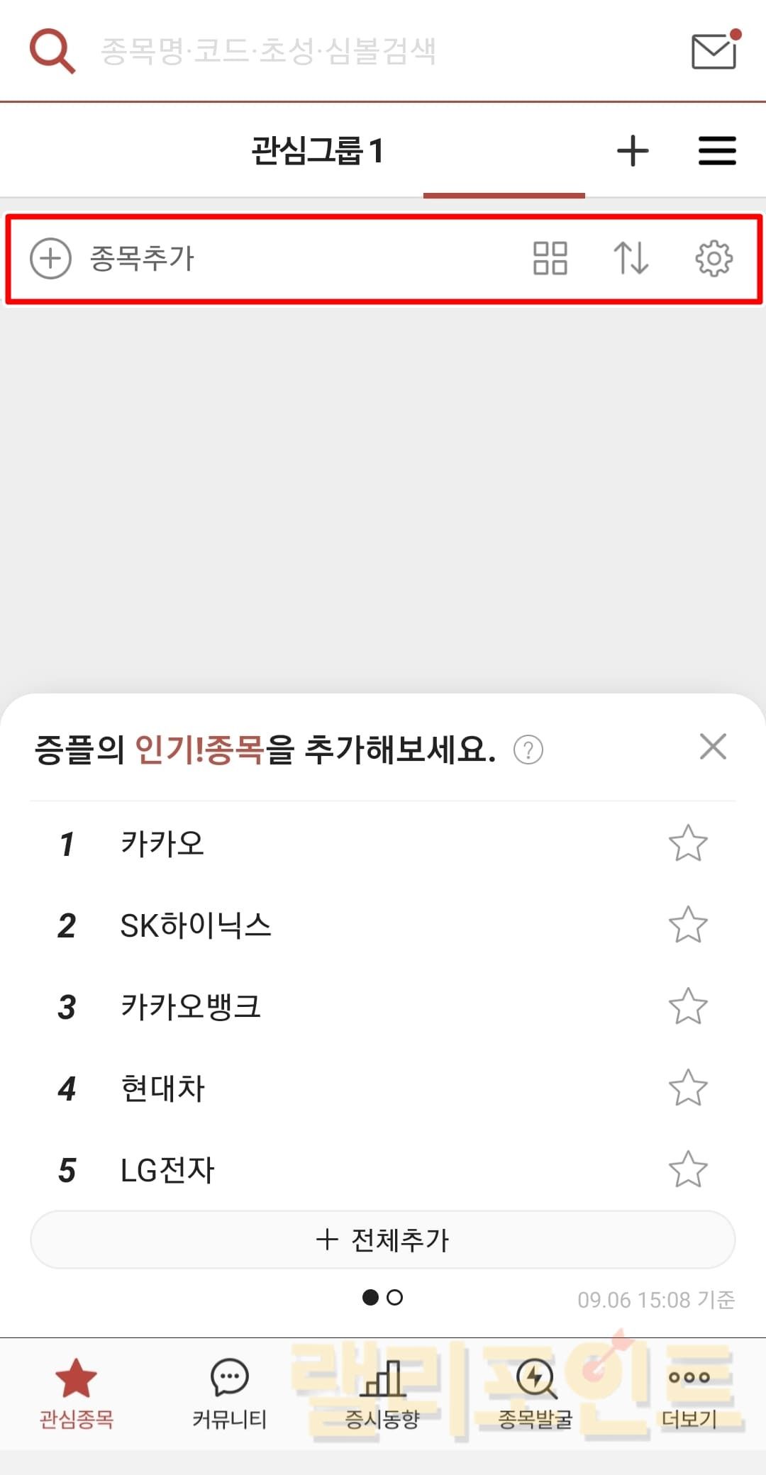 ↑ 증권플러스 앱 관심그룹에서 +를 눌러 위젯에서 보고 싶은 종목을 등록합니다.