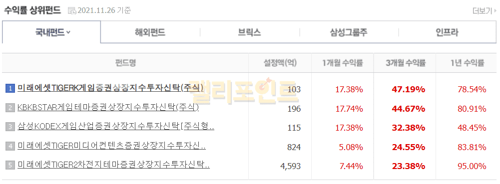 1. 국내펀드유형별 수익률 TOP5를 확인합니다.