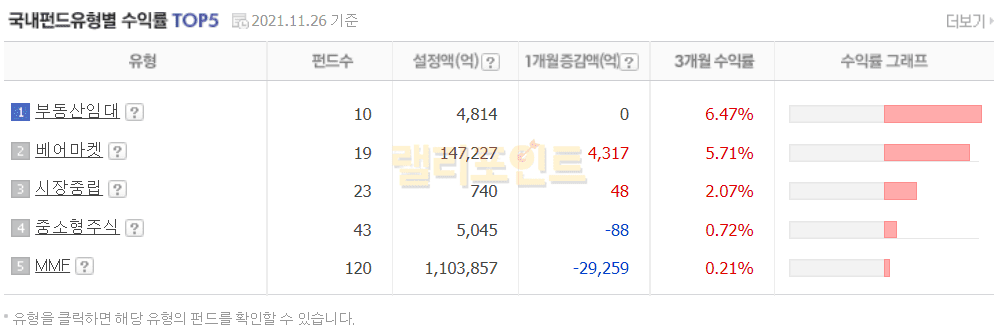 현재 시장에서 어떤 펀드 유형이 좋은 성과를 얻고 있는지 확인할 수 있습니다. 저는 현재 11월 말 기준 1.부동산임대, 2. 베어마켓 3. 시장중립 4. 중소형주식 5. MMF 순으로 좋은 수익률을 내고 있음을 조회할 수 있었습니다.