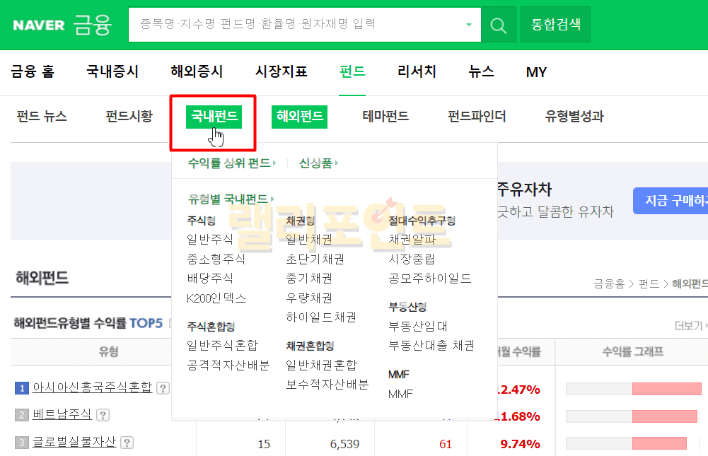 네이버금융 > 펀드 > 국내펀드 > 유형별 중 보고싶은 유형을 클릭합니다.