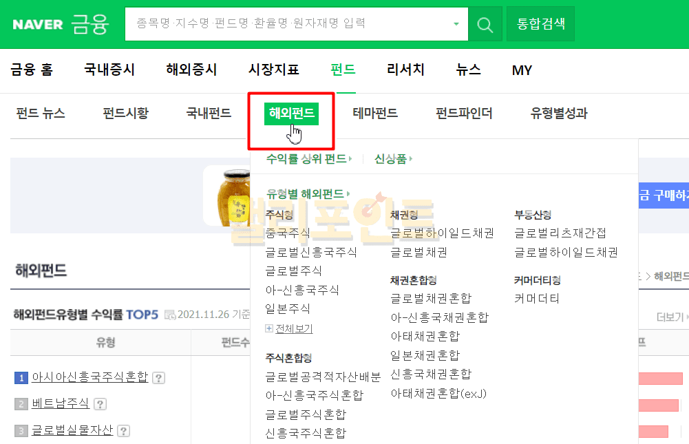 네이버금융 > 펀드 > 해외펀드 > 유형별 중 보고싶은 유형을 클릭합니다.