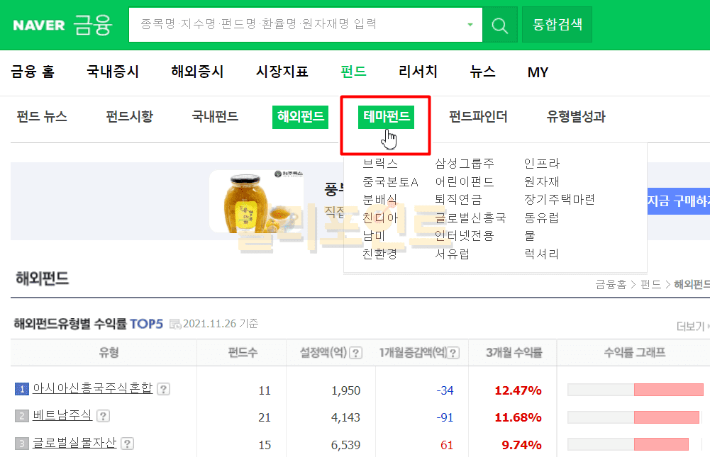 네이버금융 > 펀드 > 테마펀드 > 유형별 중 보고싶은 유형을 클릭합니다.