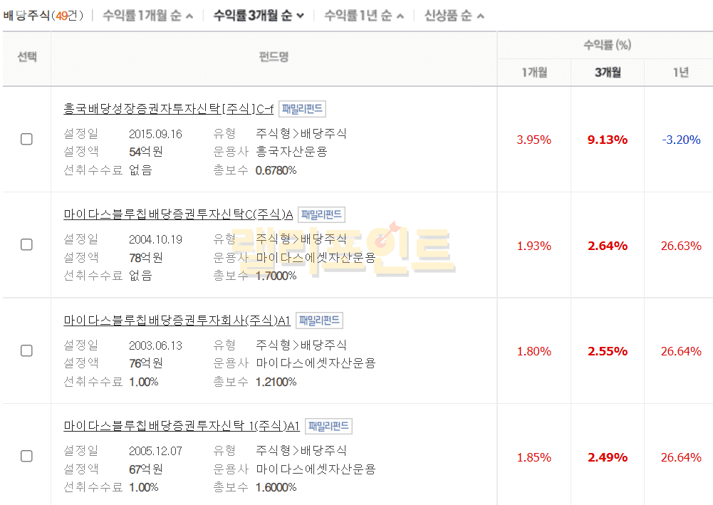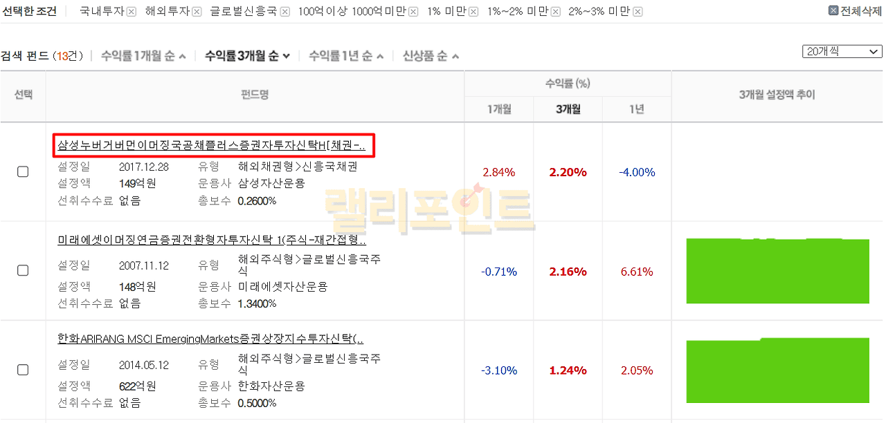 1. 검색된 조건의 펀드 수익률 순위를 확인합니다.