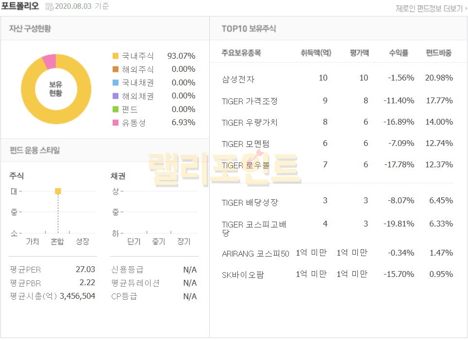 현재 펀드가 보유하고 있는 주식, 채권의 종류를 확인할 수 있습니다. 어떤 주식과 채권에 비중을 높여서 투자하고 있는지 조회해보시길 바랍니다. 포트폴리오에서는 평균PER, 평균PBR, 평균시총의 값도 확인이 가능합니다. 주식 용어를 잘 모르시겠다면 주식 용어 PER, PBR, ROE, ROA 뜻 간단 정리 글을 읽어보세요.