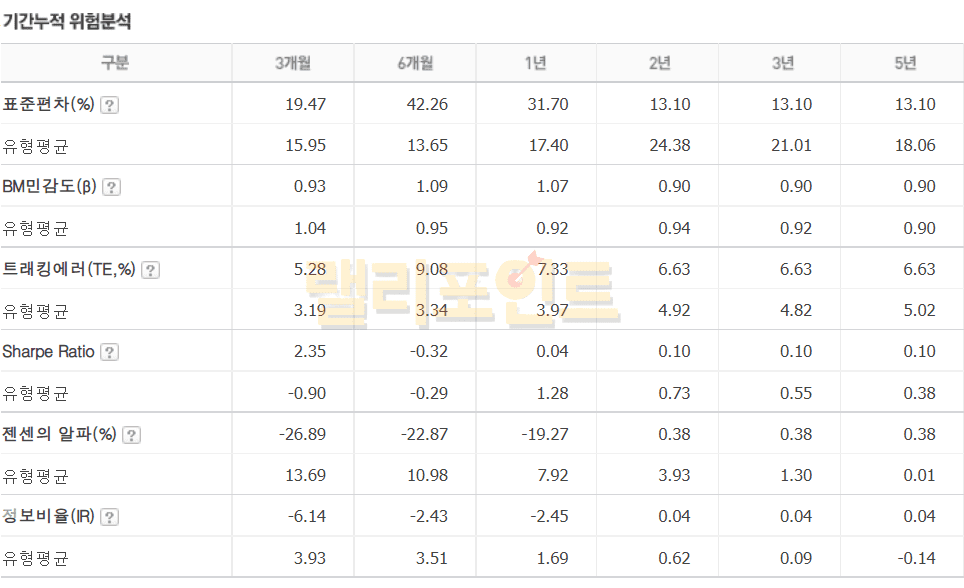 -표준편차: 투자기간 동안 펀드 수익률이 평균수익률과 대비하여 변동한 범위를 측정하기 위한 통계량으로 펀드의 위험 정도를 나타내는 지표로 이용됩니다. 값이 클수록 변동성이 심하므로 위험이 크고, 값이 작을수록 위험이 작다고 할 수 있습니다.