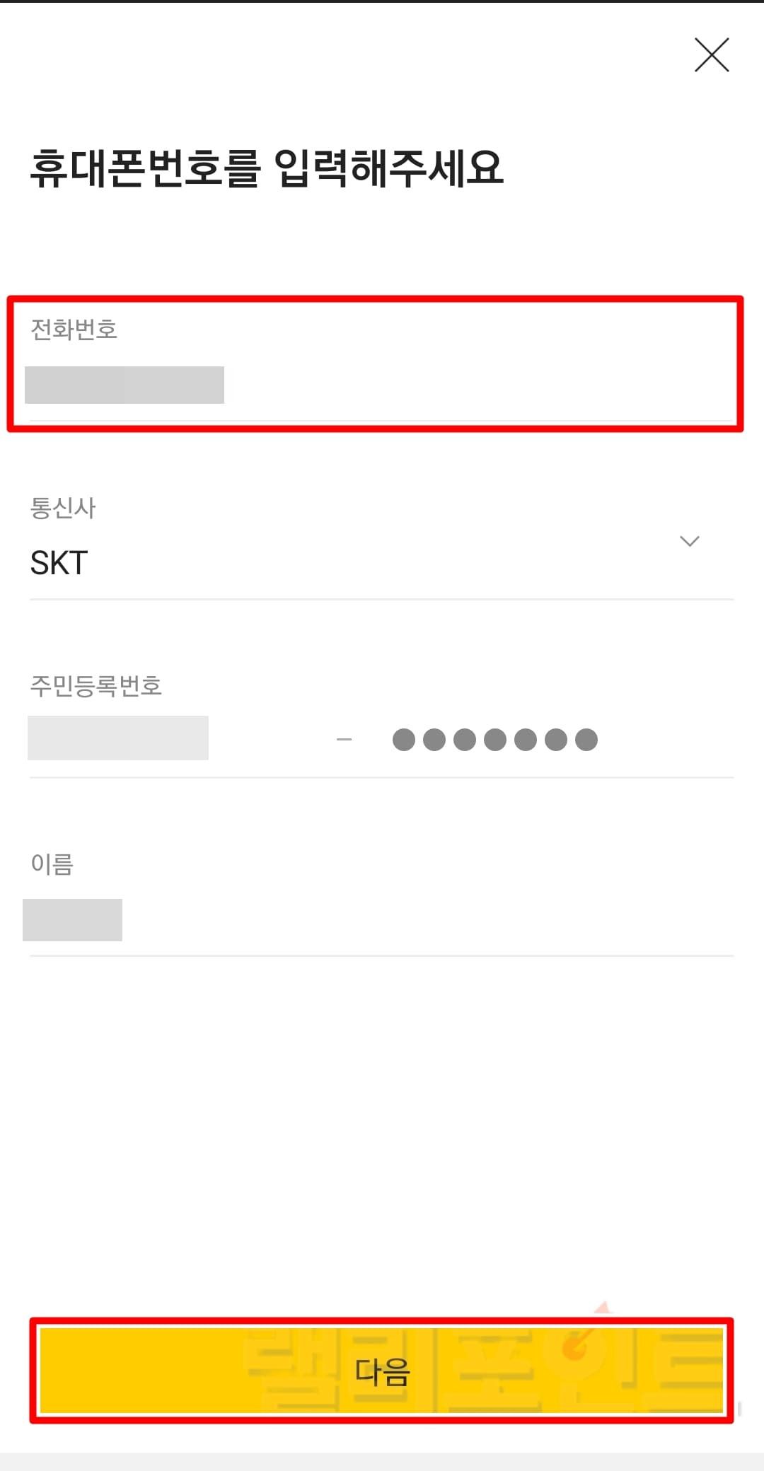 - 휴대폰번호를 기입하고 다음을 클릭합니다.