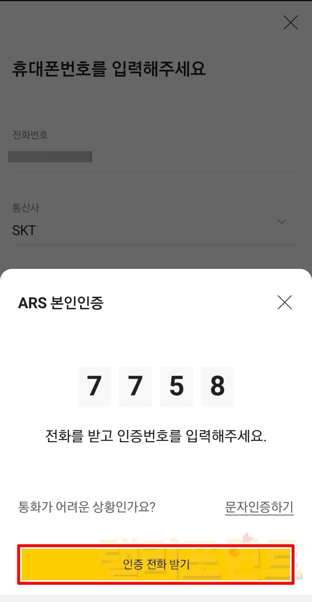 - 인증 전화받기를 누릅니다.