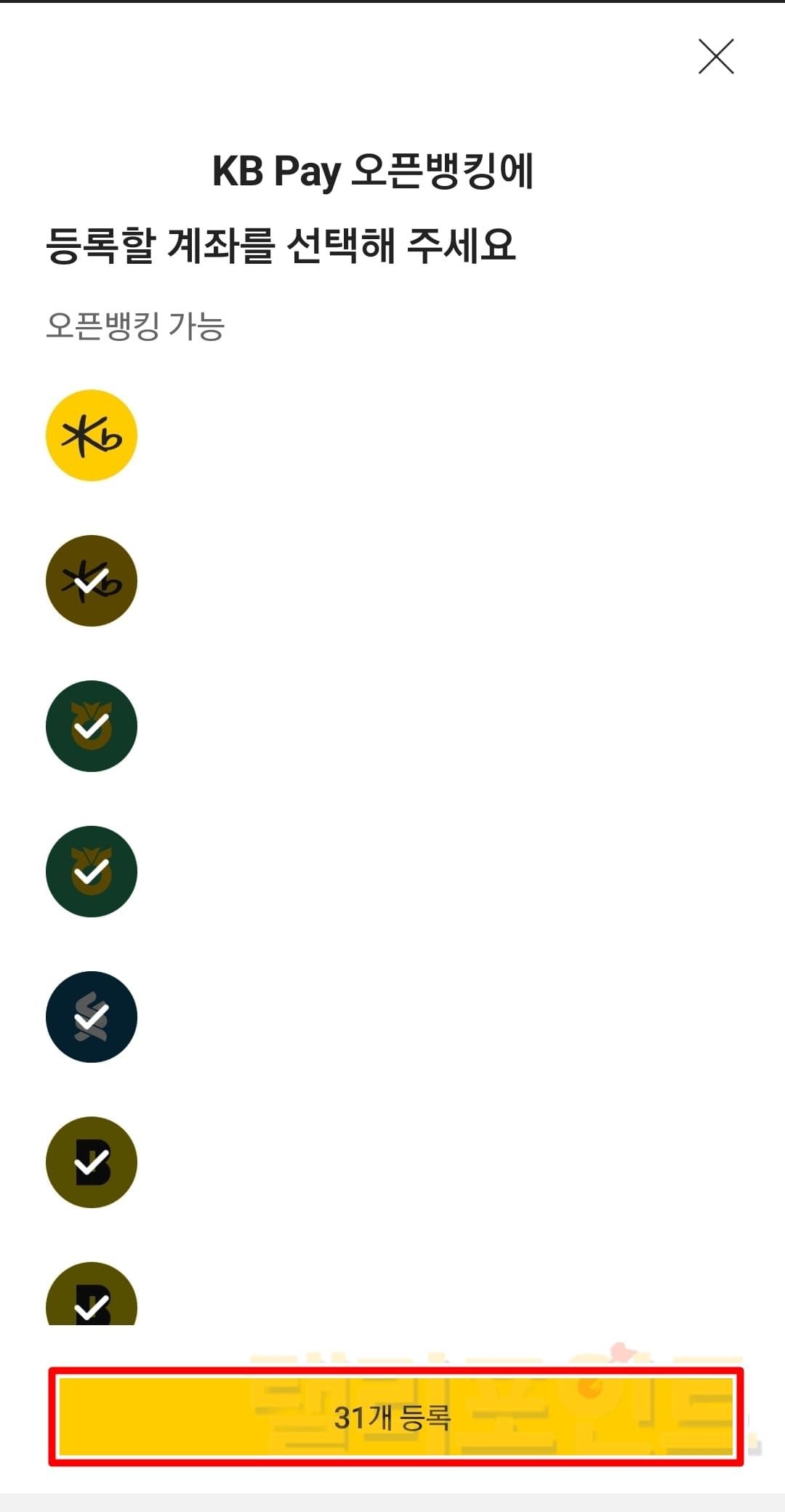 - 오픈뱅킹 계좌를 모두 선택한 후 등록을 클릭합니다.