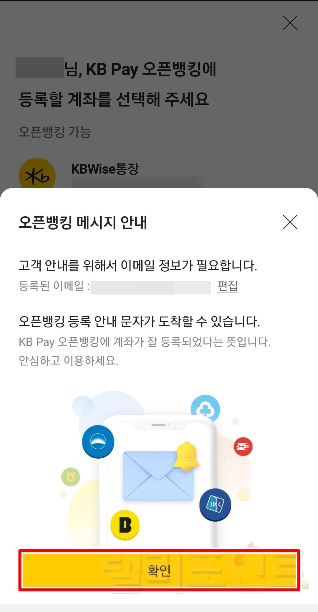 - 오픈뱅킹 메시지 안내에 확인을 누릅니다.