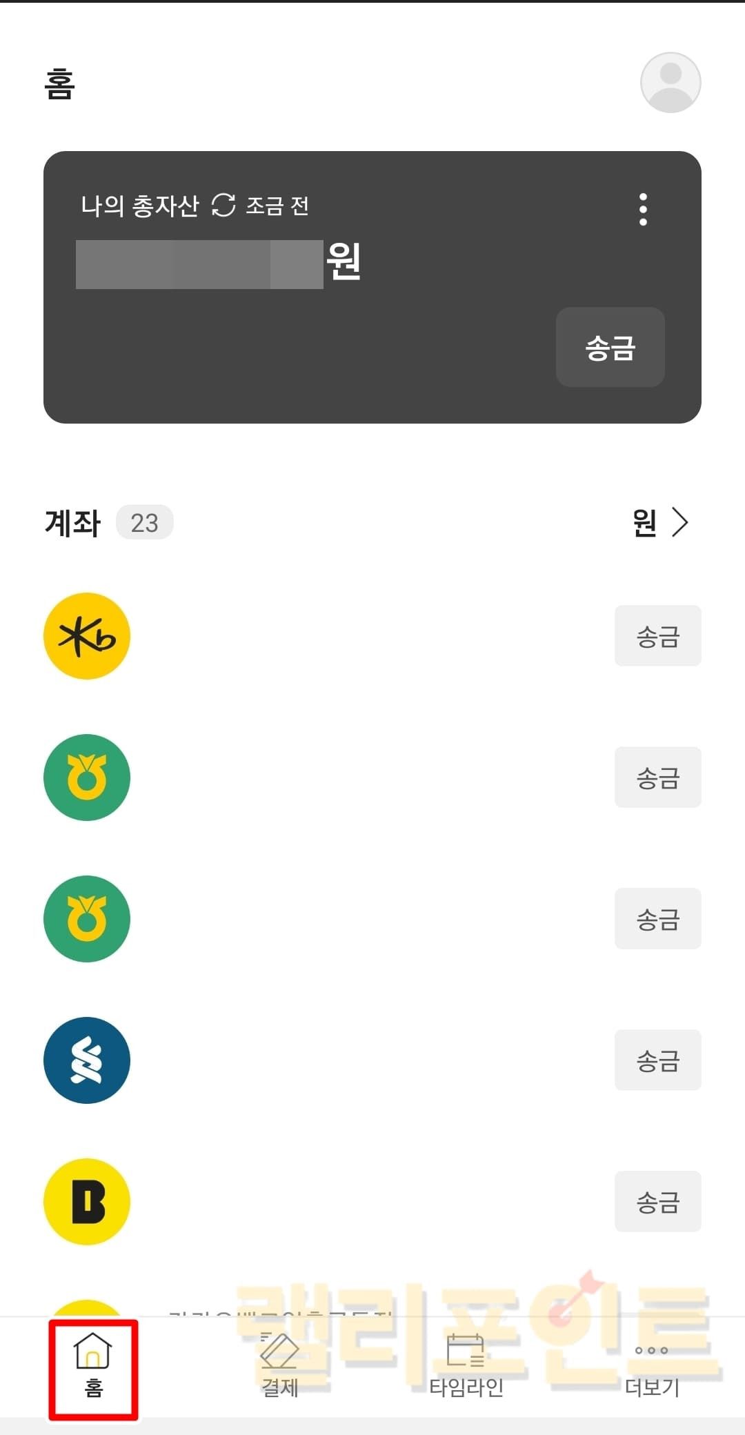 홈을 누르면 오픈뱅킹으로 등록된 모든 계좌와 금액을 확인할 수 있습니다. 어떤 은행의 계좌든 송금을 누르면 편리하게 돈을 입금시킬 수 있습니다.