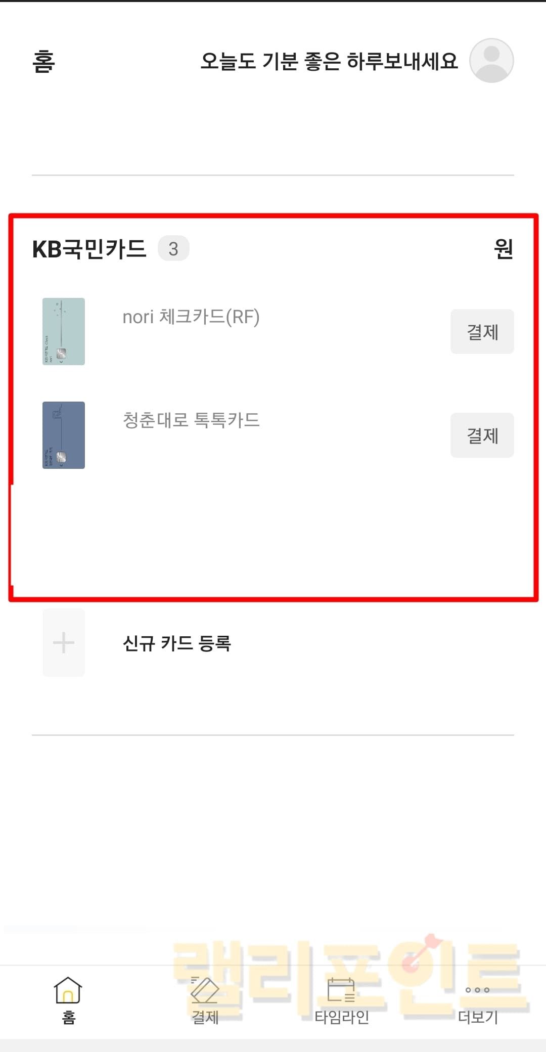 새롭게 발급받은 국민카드가 있다면 +신규카드등록을 누르고 정보를 기입해서 추가하시면 됩니다.