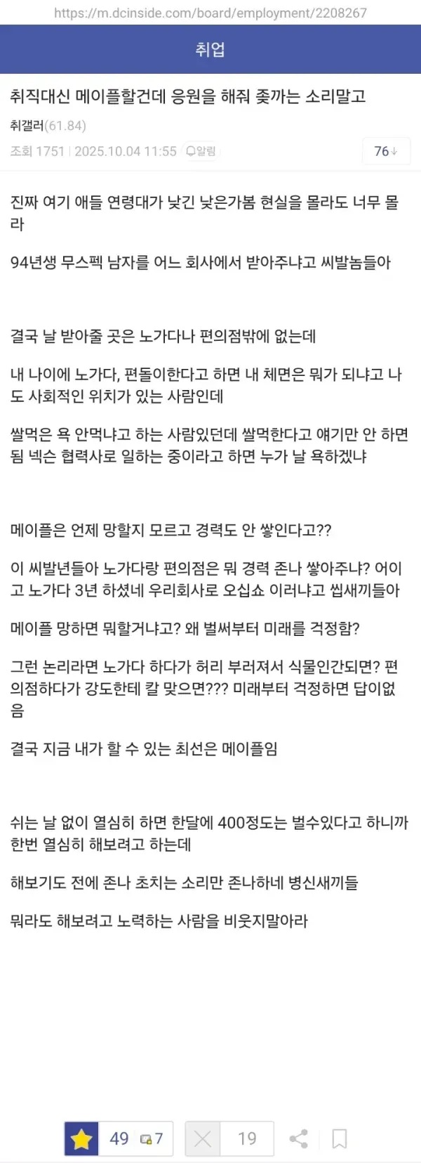 취업 포기하고 메플 쌀먹하려는 94년생