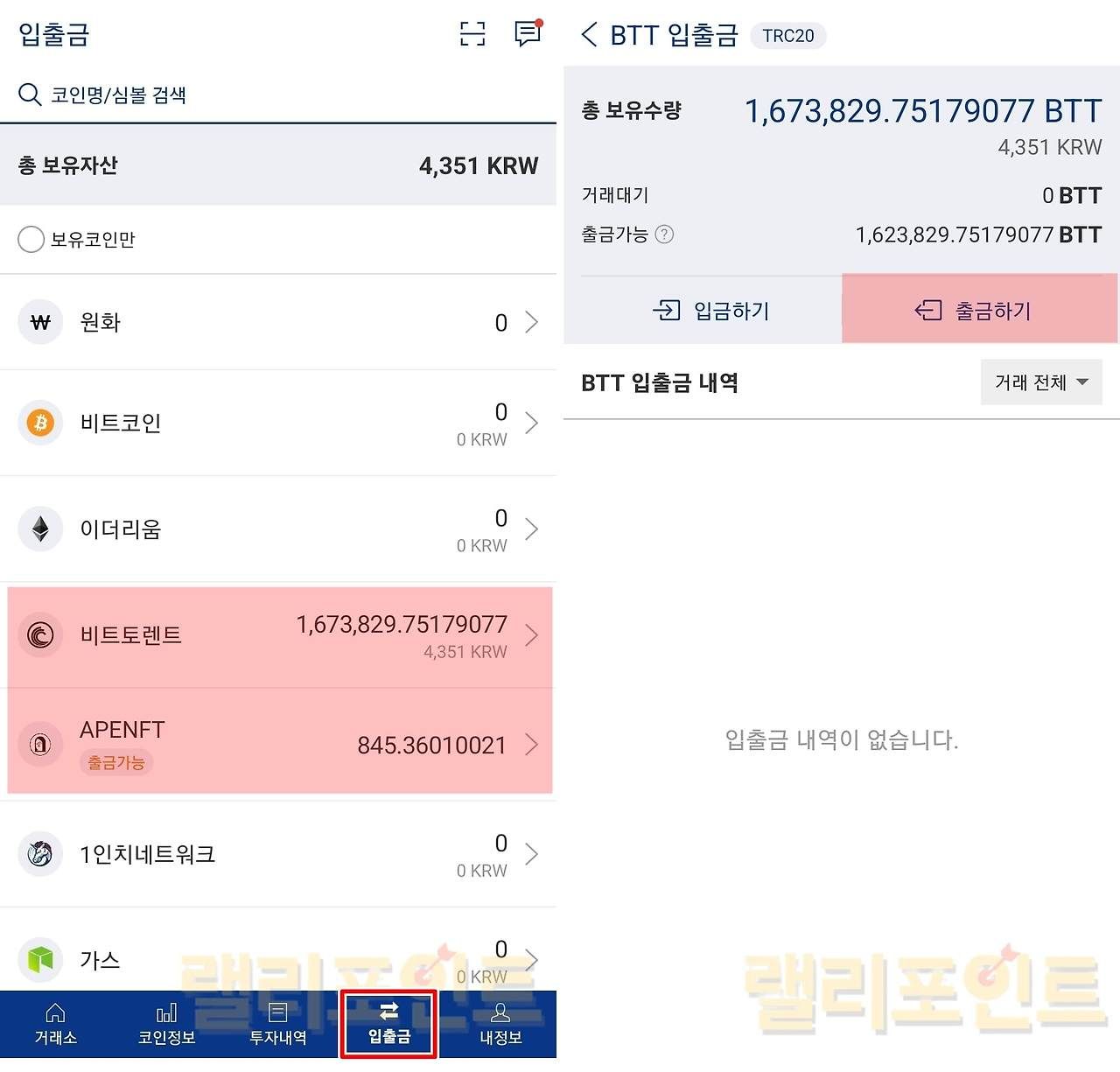 코인의 입출금의 경우 업비트 지갑이 개설되어야 합니다. 입출금 > 코인선택 > 입금하기 OR 출금하기로 이용합니다. 괸련 포스팅을 참고하세요. (업비트 지갑주소 만들기 방법 (코인 입금/출금 방법))