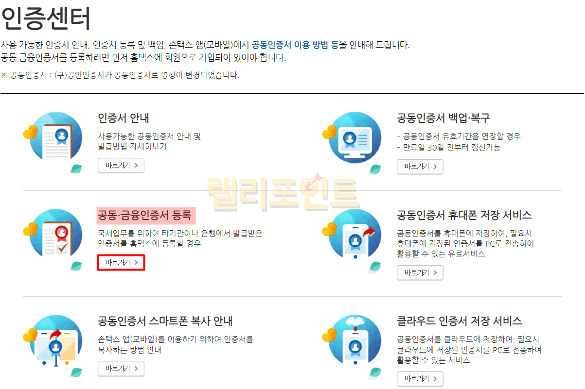 1. 공동/금융인증서 등록에서 바로가기를 누릅니다.