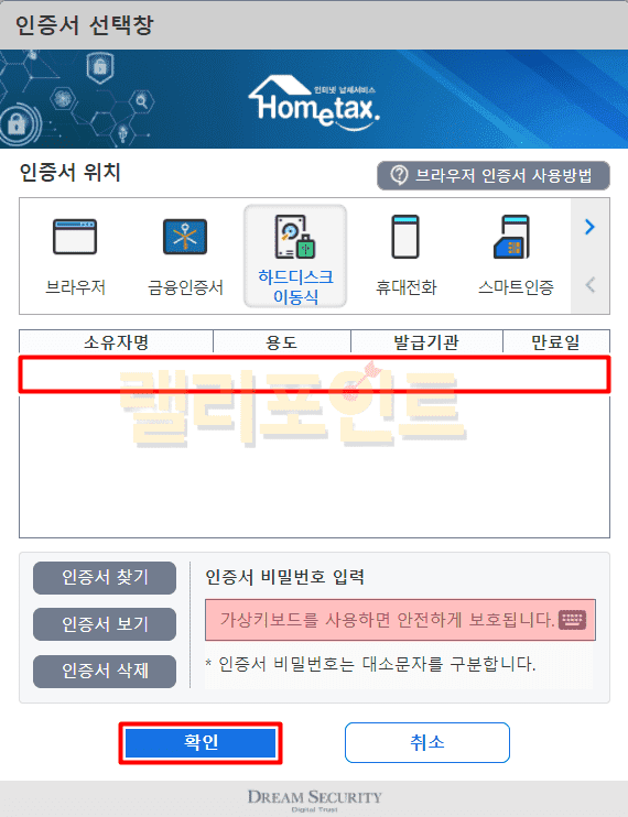 2. 인증서 비밀번호를 입력하고 확인을 누릅니다.