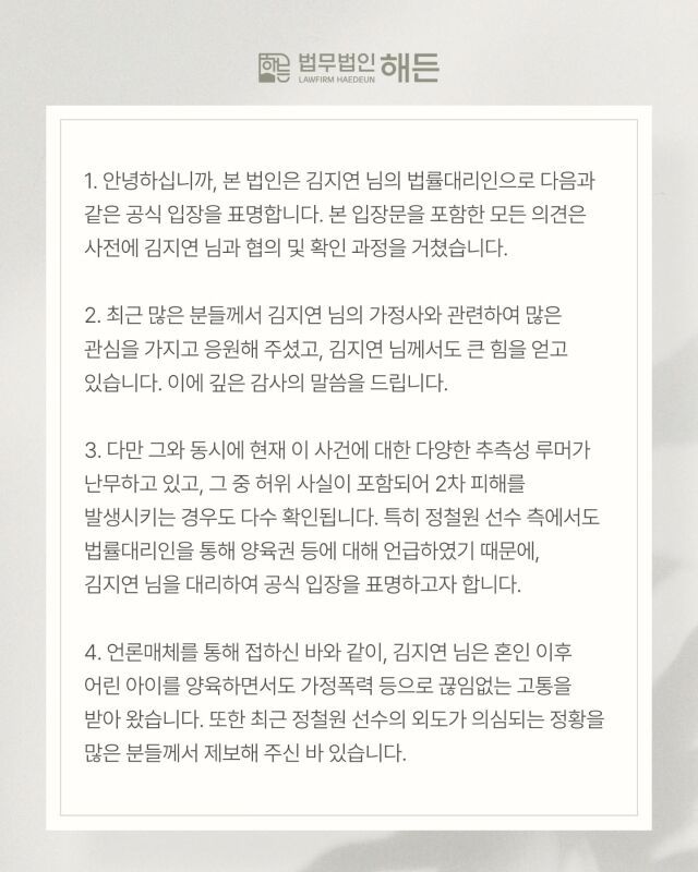 법무법인 측은 "김지연 님은 혼인 이후 어린 아이를 양육하면서도 가정폭력 등으로 끊임없는 고통을 받아왔다"며 "최근 정철원 선수의 외도가 의심되는 정황을 많은 분께서 제보해 주시기도 했다"고 밝혔다. 이어 "그럼에도 김지연 님은 아이를 생각하여 최대한 원만한 방법으로 문제를 해결하고 혼인 관계를 유지하려 노력하였으나, 아이 아버지가 아이를 두고 집을 나간 뒤 양육비 지급을 중단한 채 법률대리인을 통해 이혼과 양육권에 대해 언급하는 것에 많은 좌절감을 느끼는 상황"이라고 설명했다.