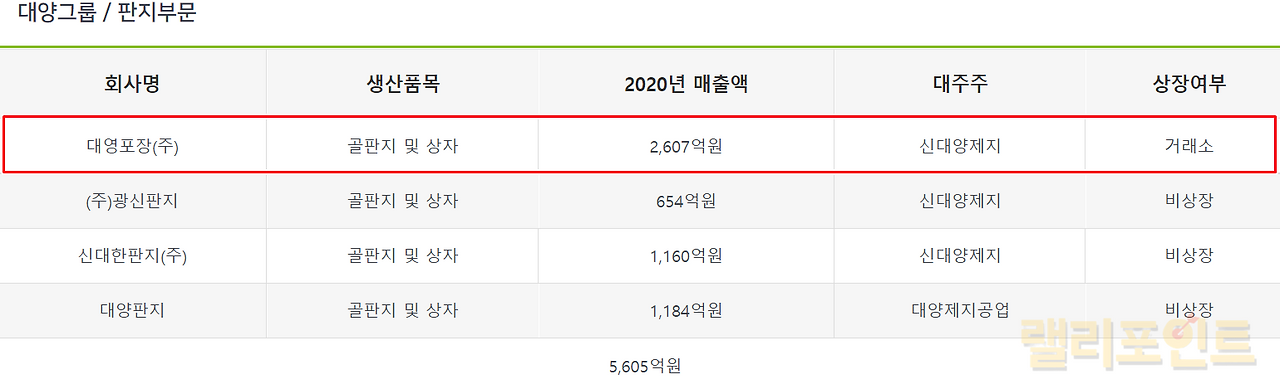 대양그룹의 판지부문에는 4개의 회사가 있는데 대영포장 외에도 광신판지, 신대한판지, 대양판지가 있습니다. 모두 동일하게 생산품목이 골판지 및 상자로 같습니다. 다만 다른 3개의 회사는 비상장인 반면 대영포장(주)의 경우 현재 코스닥에 상장되어 있으며 매출액 규모가 3개의 회사보다 2,607억으로 압도적으로 높습니다.