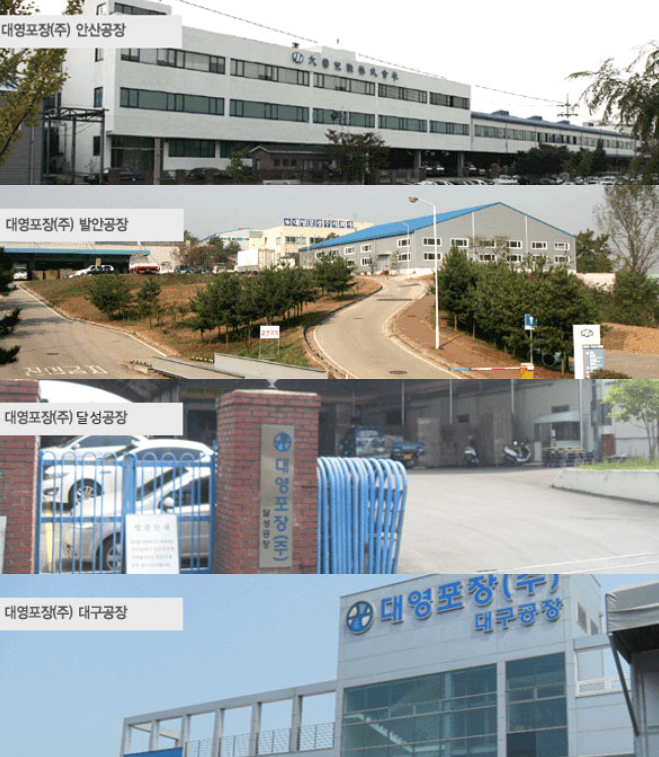 대영포장은 4개의 공장을 현재 운영하고 있으며 안산공장, 발안공장, 달성공장, 대구공장이 있습니다. 위에서 말씀 드렷듯이 골판지사업의 경우 운송 비용과 인쇄사양이 요구됨으로 수요처와 가까울수록 좋은데 각 지역별로 각 공장지부가 있기 때문에 꾸준한 매출처를 통해 매출과 이익을 낼 수 있습니다.