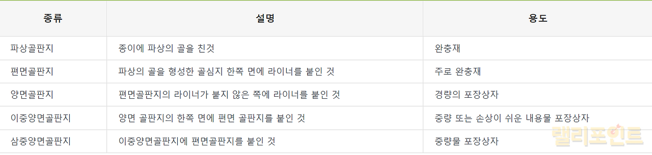 대영포장이 취급하는 골판지의 종류를 간단히 소개드리자면 파상골판지, 편면골판지, 양면골판지, 이중양면골판지, 삼중양면골판지가 있습니다. 모두 용도는 상품의 완충재로 사용되거나, 포장상자에 이용됩니다. 사업의 구조가 단순하기 때문에 분석이 용이하고 앞으로의 실적과 주가 전망을 유추하기 좋습니다.