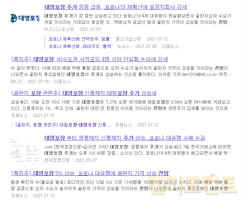 대영포장의 최근 뉴스들을 살펴보면 코로나 대유행 수혜를 받아 주가 상승에 두각을 나타내고 있다는 것입니다. 코시국으로 인해서 비대면이 각광받으며 온라인커머스(쇼핑)의 증가로 식료품이나 옷, 가구 등 모든 상품에 대해서 배송이 늘어나게 되었는데요. 여기에 사용되는 완충재나 포장 상자를 취급하는 것이 대영포장이기 때문에 코로나로 인해서 확진자가 늘어나거나, 코로나 종결에 관한 부정적인 뉴스가 나올 때마다 큰 폭으로 상승이 이뤄지고 있습니다.