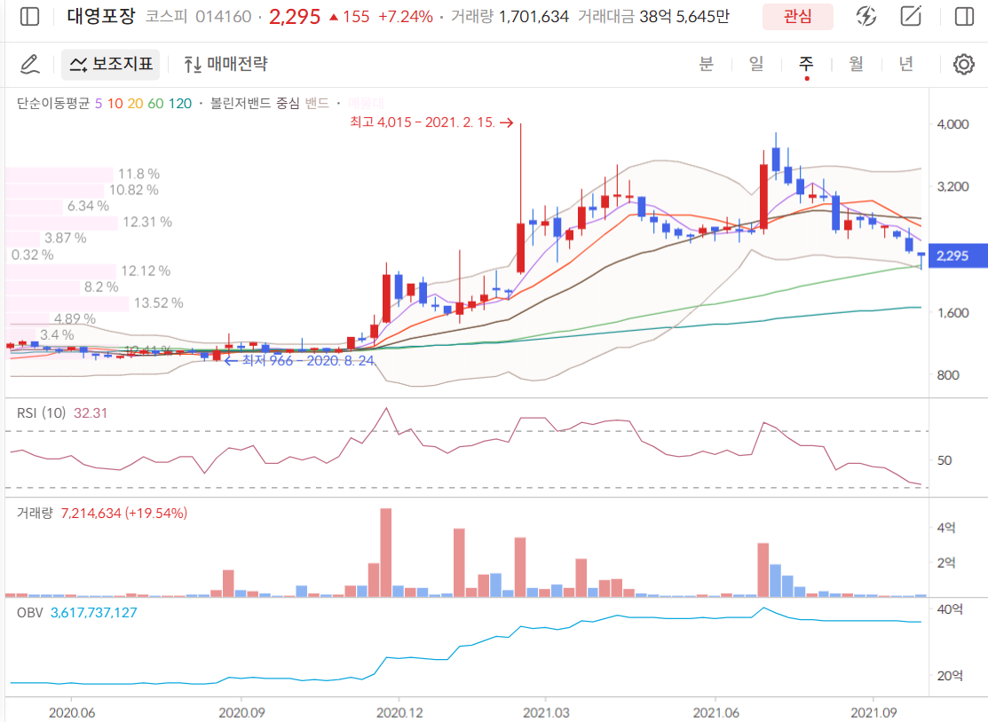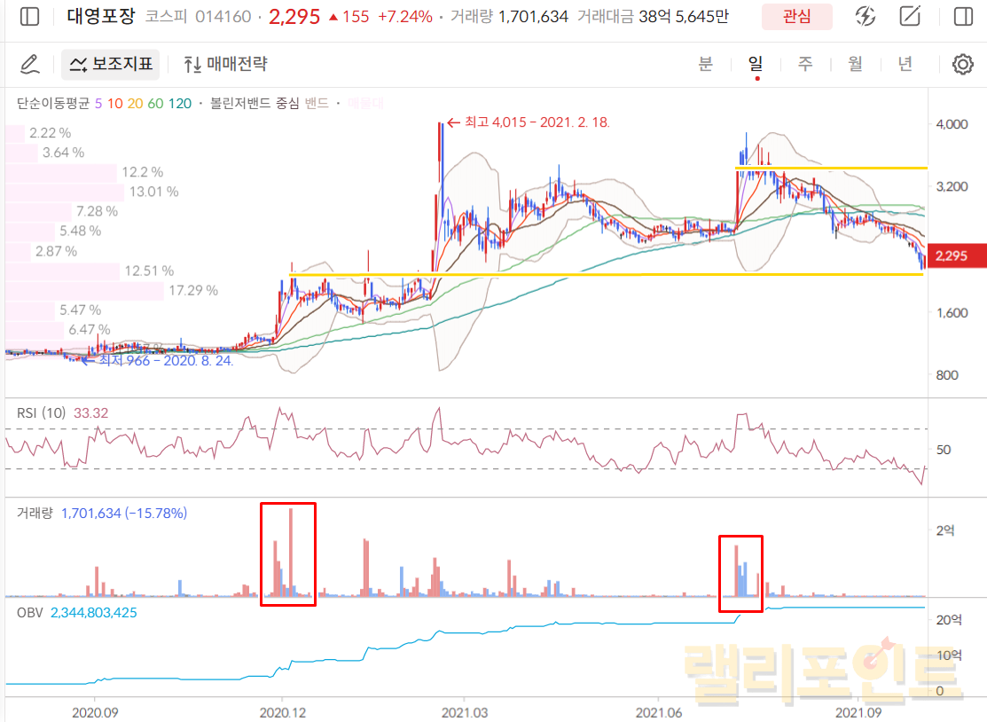 따라서 객관적으로 차트분석을 해보자면 대영포장 주가 전망은 거래량에 따른 2,200원 하락지지, 3,350원 돌파여부를 확인해봐야하는데요. 상대강도지수인 RSI상에서는 일봉차트의 현재지점은 30부근으로 과매도구간으로 매수 시점이라고 판단해볼 수 있습니다. 이 후 2,200원 하락지지를 확인한 후에는 3,350원 돌파시 홀딩, 돌파실패시 일부 익절을 하는 것이 좋아보입니다. 현재 OBV지표는 계속해서 상승중이며 매집해가는 세력이 존재한다고 보기에 단기 저평가 구간이라고 판단내릴 수 있겠습니다.
