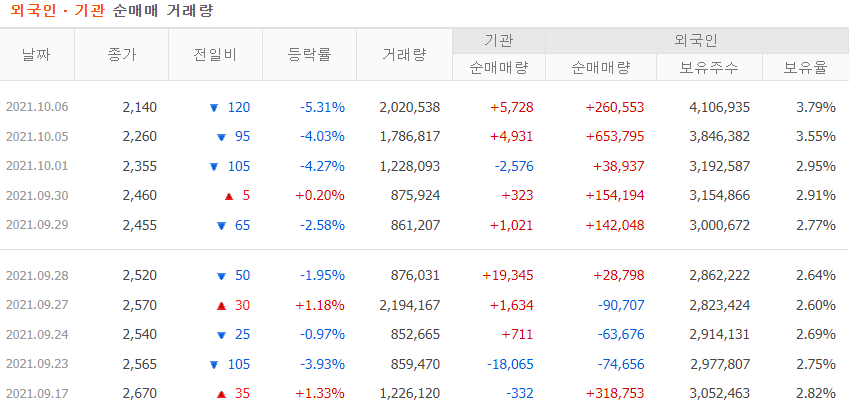 대양포장 주가 전망을 분석하면서 가장 인상적으로 본 것은 외국인 보유율의 상승입니다. 최근 6거래일간 높은 순매매량으로 외국인 지분이 2.60%에서 3.79%로 상승하였는데 이는 타종목대비 아직 외국인 보유율이 더 높아질 여지가 충분하다고 판단할 수 있겠습니다. 최근 환율의 급등으로 인해서 내수산업인 대양포장의 주가가 함께 흘러내렸다고 보고 있으며, 현재 환율 1200원 근방부터는 환저에 힘입어 상대적으로 저렴한 With코로나 수혜주인 대양포장을 외국인이 지속 매수하는 흐름이 이어지리라 예상합니다. 그 외에도 개인의 지속적 매도와 기관매수는 큰 호재라고 할 수 있겠네요. 매매동향을 계속 분석하면서 외국인의 매수시점과 거래량을 유추해보는 트래킹 작업이 지속적으로 필요해보입니다.