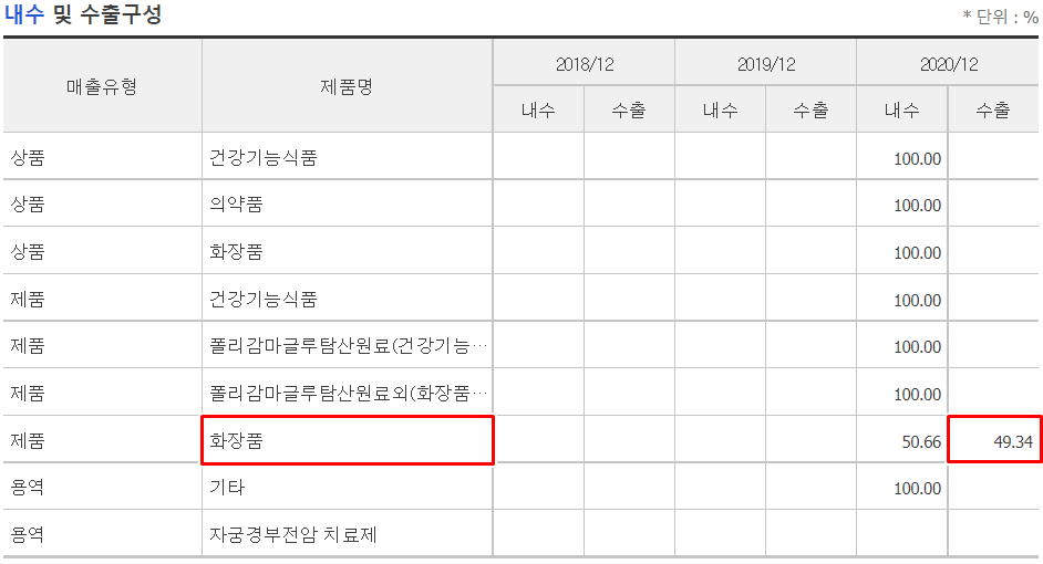 건강기능식품, 의약품, 화장품, 건강기능식품, 폴리감마그르루탐산원료류(건강기능/화장품), 화장품 등이 주요 매출품목입니다. 여기서 대다수 내수시장이지만 현재 화장품의 경우 내수와 수출의 비중이 50% 정도임이 특징입니다. 바이오리더스는 이전 최대 중국 의약그룹인 시노팜과 화장품 독점 계약을 맺은 적이 있는데 이를 통한 중국쪽 매출임으로 생각됩니다. (이러한 시노팜과의 화장품 계약이 있던 과거로 시노팜 백신 및 중국 백신에 대한 국내 협상 관련 뉴스가 나올 때마다 주가 급등이 이뤄지곤 했습니다.) 바이오리더스의 경우 중국 쪽의 사업 인맥이 확보되었다는 소리로 받아들일 수 있기 때문에 추후 한한령 해제에 대한 화장품 주 수혜도 기대해볼 수 있습니다.