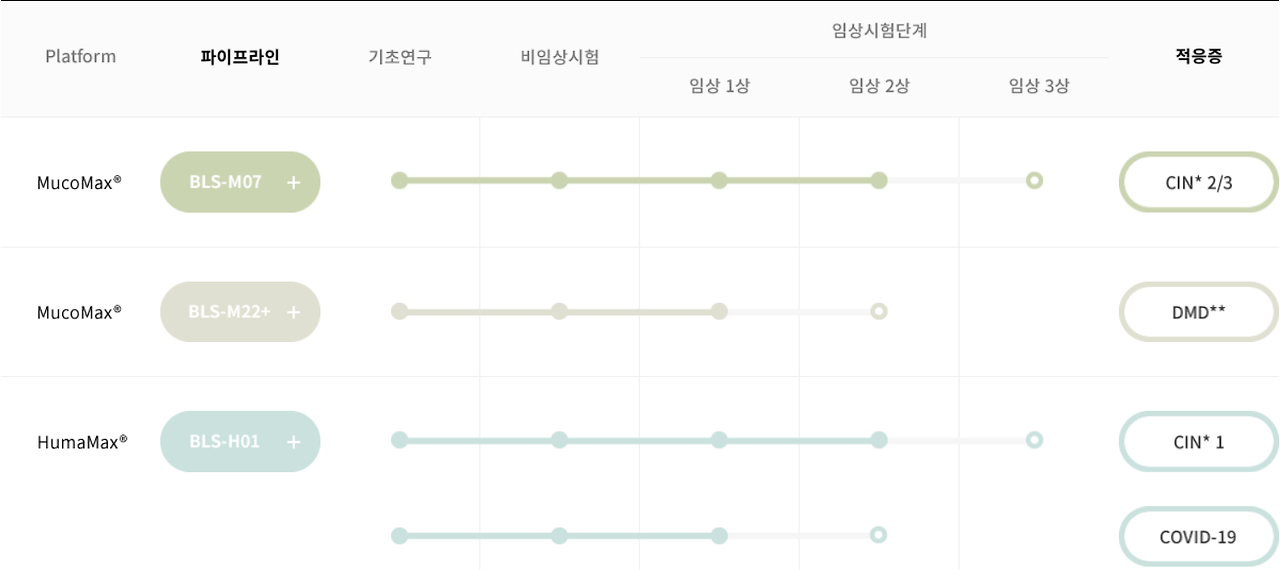 BLS-M07(H.CIN1 치료제 + 자궁경부전암 치료백신)-자궁경부질환 조기 검진 시 치료 신약은 임상 2상 이후 현재 임상 3상 목표중입니다. BLS-M22는 유전성 희귀 소아질환인 듀센형 근이영양증 치료제로 임상 1상을 마친 후 임상 2상 목표중입니다. BLS-H01은 (H.CIN1 치료제 + 자궁경부전암 치료백신)으로 BLS-M07과 마찬가지로 임상 1상을 마치고 임상 2상을 목표중입니다.