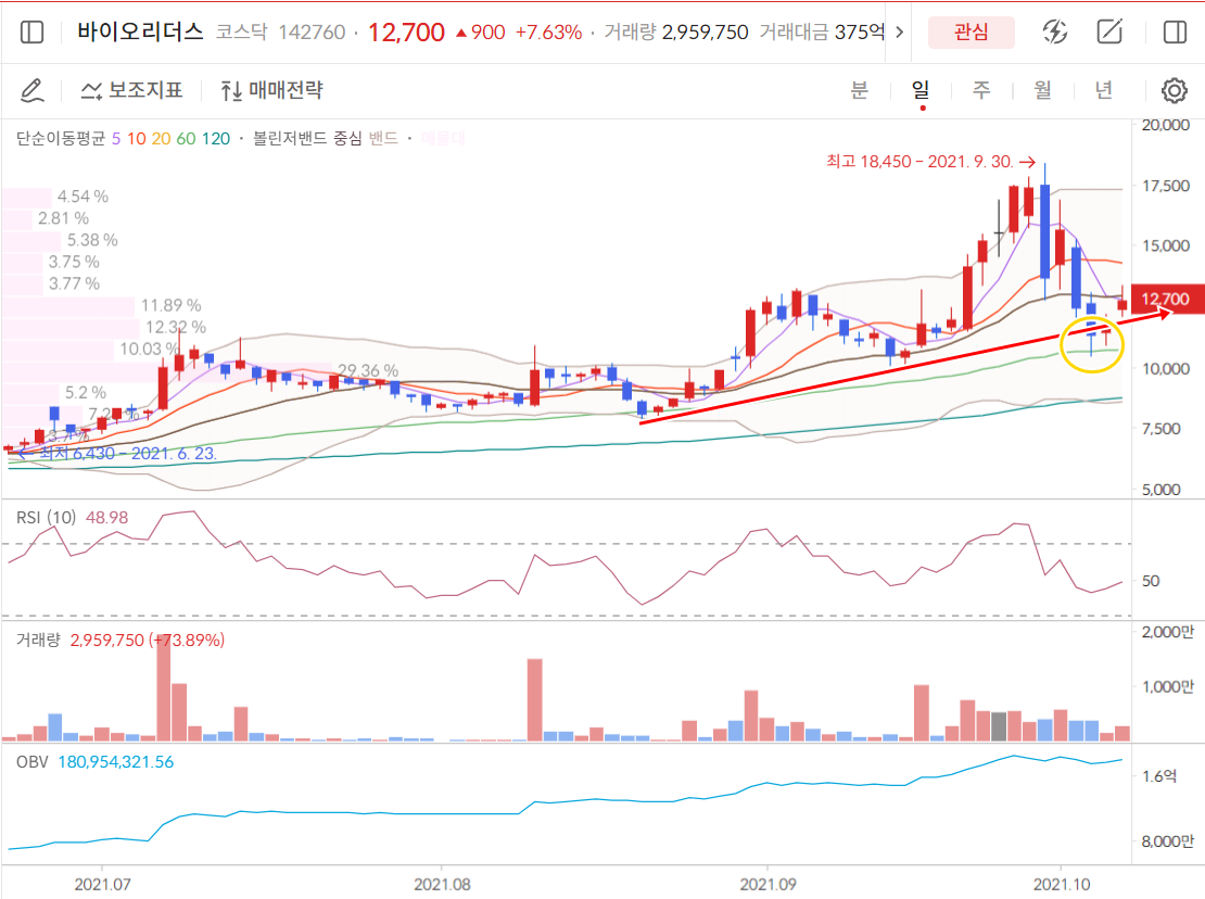 먼저 상승이 바이오리더스 일봉 차트를 가져와보았습니다. 상승이 본격적으로 시작되었다고 판단하는 2021년 중순경부터 현재까지의 모습인데요. 60일선을 바닥으로 저점을 조금씩 높여가는 우상향 차트를 그려나가고 있습니다. 최근 60일선을 강하게 이탈한 적이 있었지만 역망치 형태로 종가 전 매물을 가져가며 지지해준 것이 인상적이며 앞으로 중단기간 1만원이하를 깨는 일은 힘들지 않을까 싶습니다. 상승 일봉 차트의 저점간에 선을 그어보더라도 최근 다시 정상적인 우상향 흐름을 이어갈 것이 예상되며 18년도의 강한 상승세 이 후 약 3년간 저점횡보를 하다보니 현재가 12,700원 상방에도 저항매물대가 거의 없는 것이 장점입니다. 연말 ~ 내년 연초에는 역사적 신고가를 부근을 한번 찍지 않을까 기대해볼 수 있을 것 같습니다.