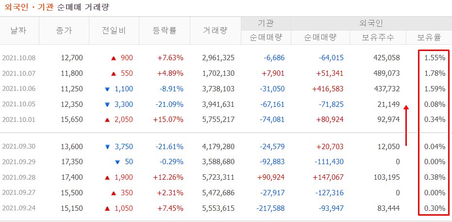 현재 최근 10일간의 주요 수급분석을 위한 거래 표를 가져와보았습니다. 잠깐의 조정기에 외국인 보유지분량이 0.00% ~ 1.78%까지 상승한 흐름으로 외국인의 강한 매수세가 보여지고, 기관과 개인은 일부의 익절로 보여집니다. 전체 주식 수 대비 높은 거래량을 기록하고 있음으로 주가 향방을 결정짓는 손바뀜이 계속해서 이뤄지고 있는 상황으로 판단내릴 수 있겠습니다.