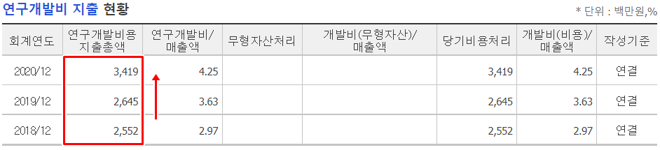 바이오리더스 주가 전망을 판단하기에는 연구개발비 지출을 참고하는 것이 효과적으로 보여집니다. 바이오리더스는 2018년도부터 최근 3개년까지 연구개발비용 지출총액이 2,552 > 2,634 > 3,419 (백만원)으로 증가하였으며 이는 지속적으로 확보한 자금을 신약개발에 사용하고 있음을 확인할 수 있는 중요지표입니다.