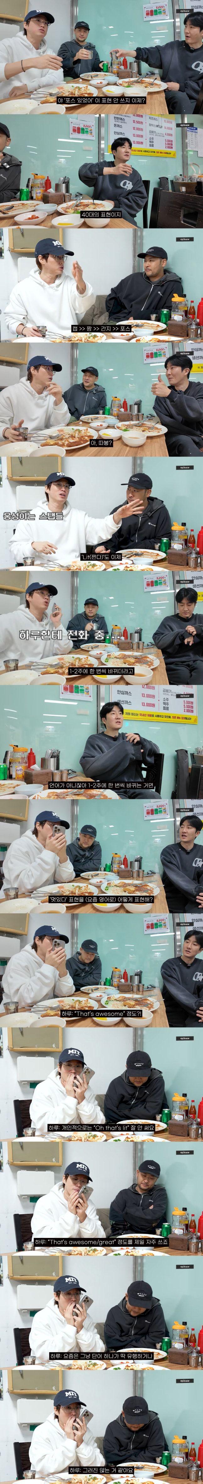 그러자 타블로는 "투컷 삼촌이 그렇게 말하면 촌스러운 거냐"고 물었고, 하루 양은 "그런 건 아니지만 요즘은 그냥 단어 하나가 딱 유행하거나 그러진 않은 거 같다. 'That's awesome', 'great' 정도를 제일 자주 쓴다"라면서 요즘 학생들이 사용하는 언어에 대해 설명했다.