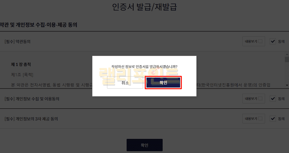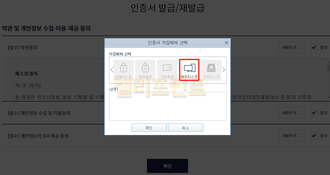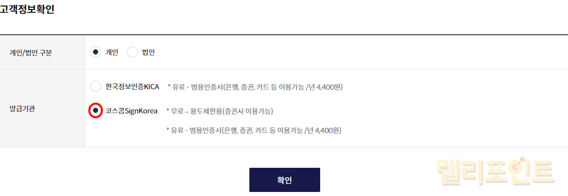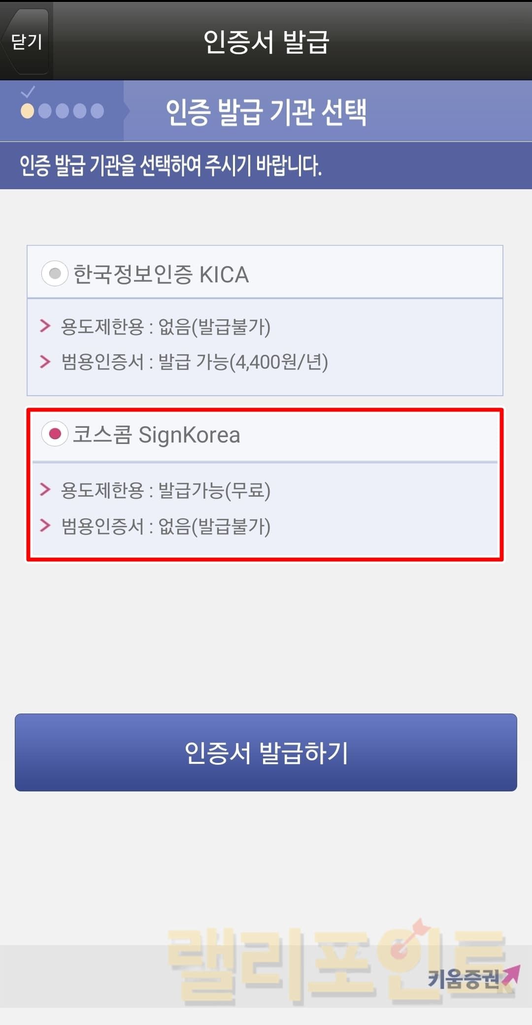 - 발급 기관에서 코스콤 SignKorea를 선택합니다.