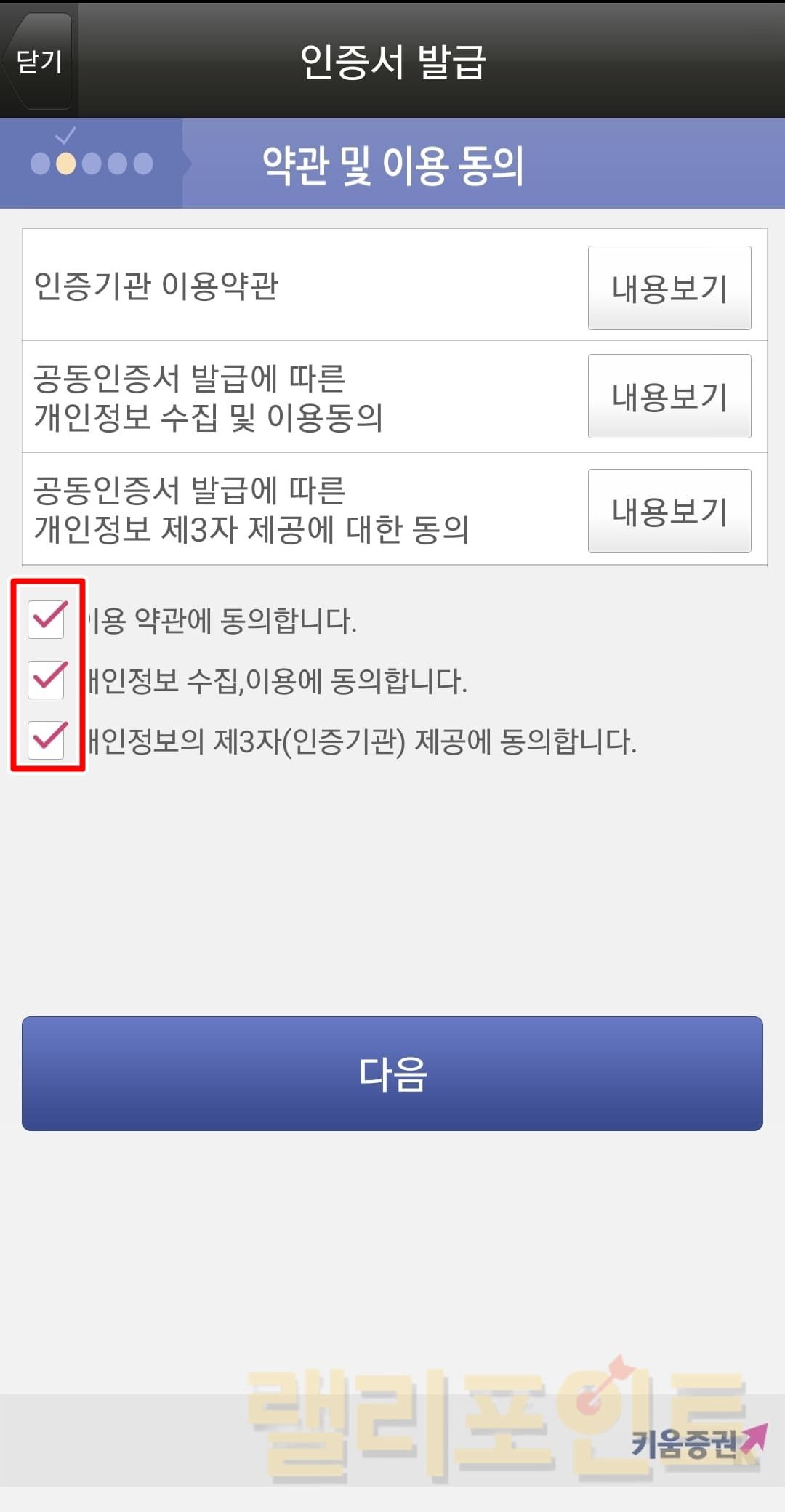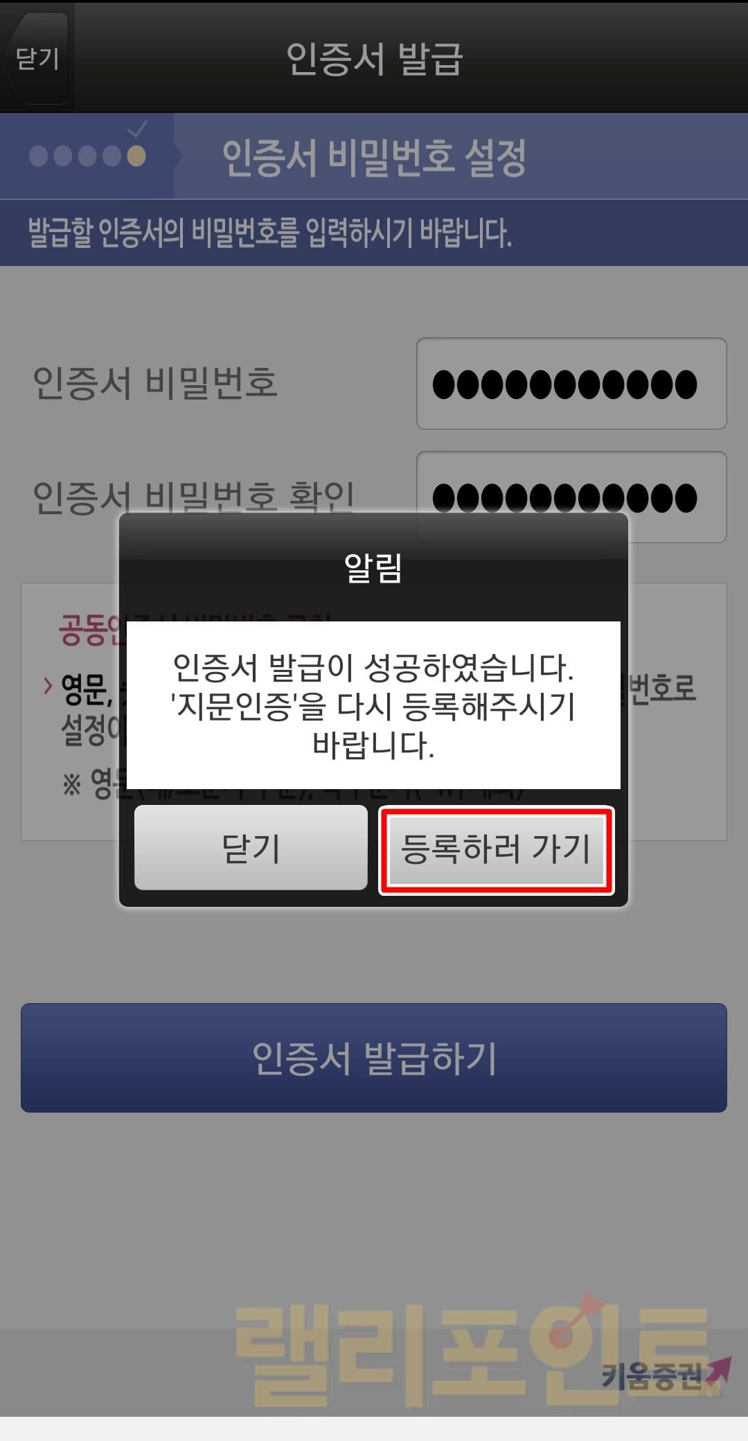 - 모바일에서 키움증권 공동인증서 발급이 성공하였습니다.