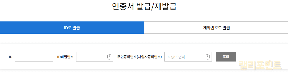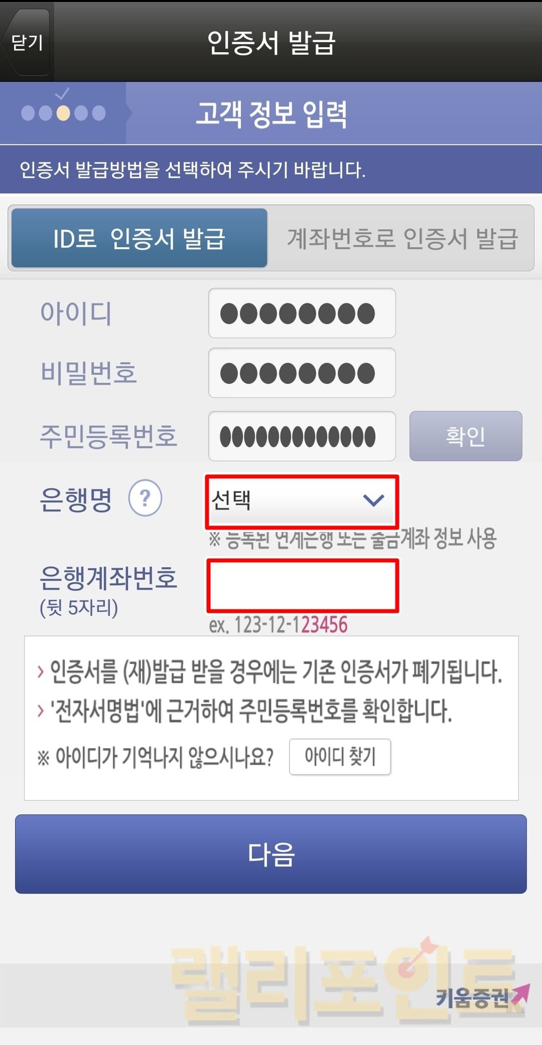 - ID 또는 계좌번호 발급을 선택하여 정보를 입력합니다.