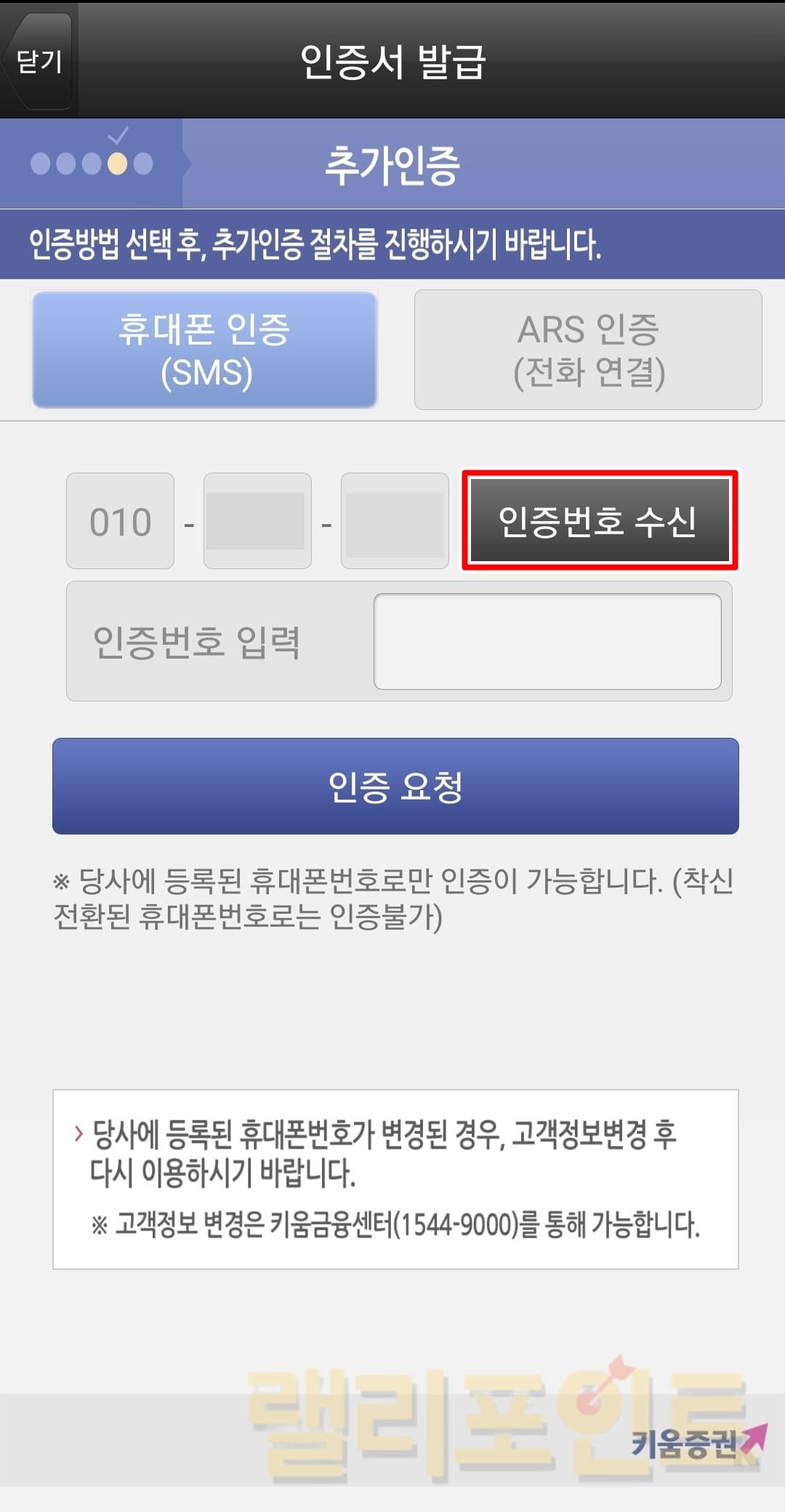 추가 인증의 경우 키움증권에 등록된 휴대폰번호로만 인증이 가능합니다. 만약 휴대폰번호가 변경된 경우 고객정보변경 후 다시 이용해야 합니다. 고객정보 변경은 키움금융센터(1544-9000)에 전화하여 요청하시면 됩니다.