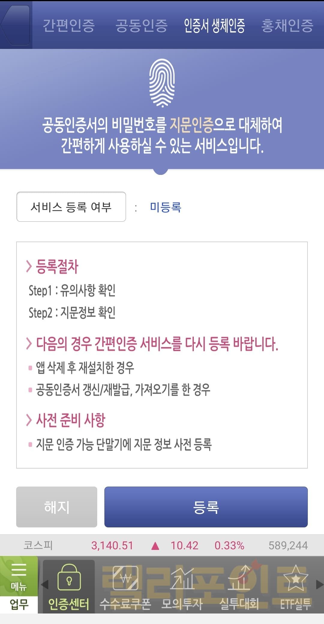 ▲ 로그인 이후 간편인증과 생체인증을 등록할 수 있습니다. 현재 이용중인 스마트폰의 생체정보(지문,홍체)를 연동하여 사용할 수 있고 이후에 간편하게 로그인을 할 수 있어서 설정을 권장드립니다.
