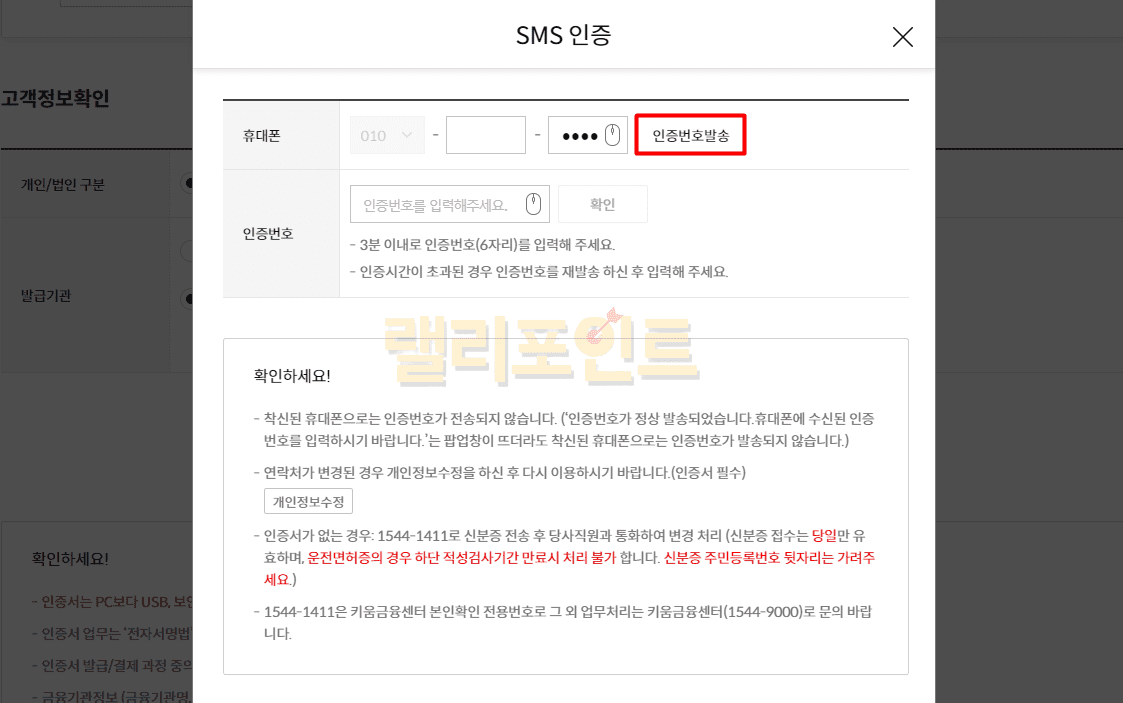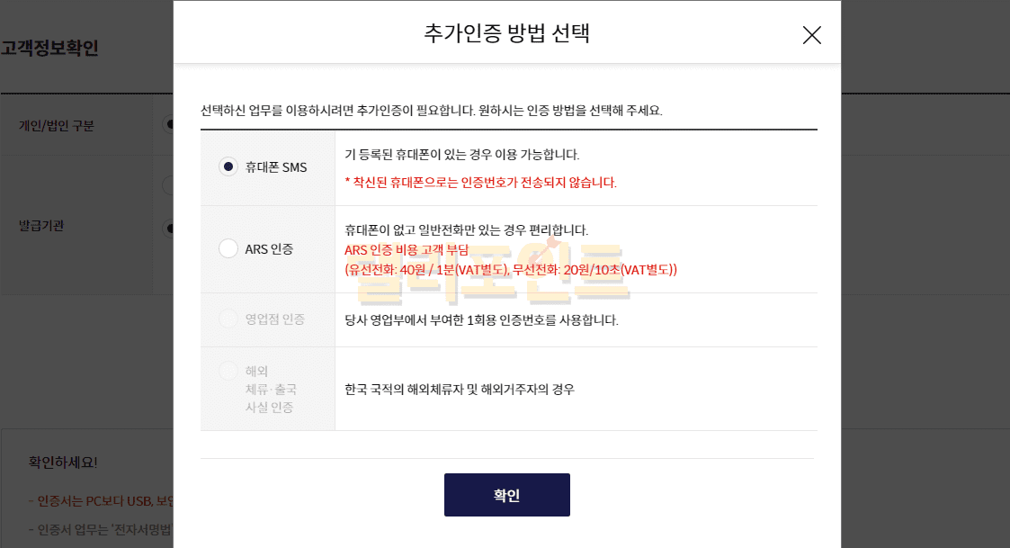 - 휴대폰 SMS 문자 또는 ARS 전화 인증을 진행합니다.