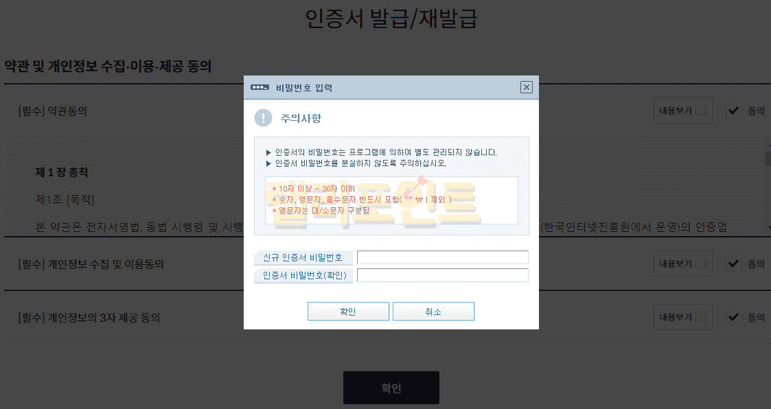 키움증권 공동인증서는 영문과 숫자, 특수문자가 모두 들어간 10~30자리의 비밀번호로 설정할 수 있습니다. 이 때 영문의 대/소문자가 구분되고 특수문자의 \은 입력이 불가능하니 주의하시길 바랍니다.