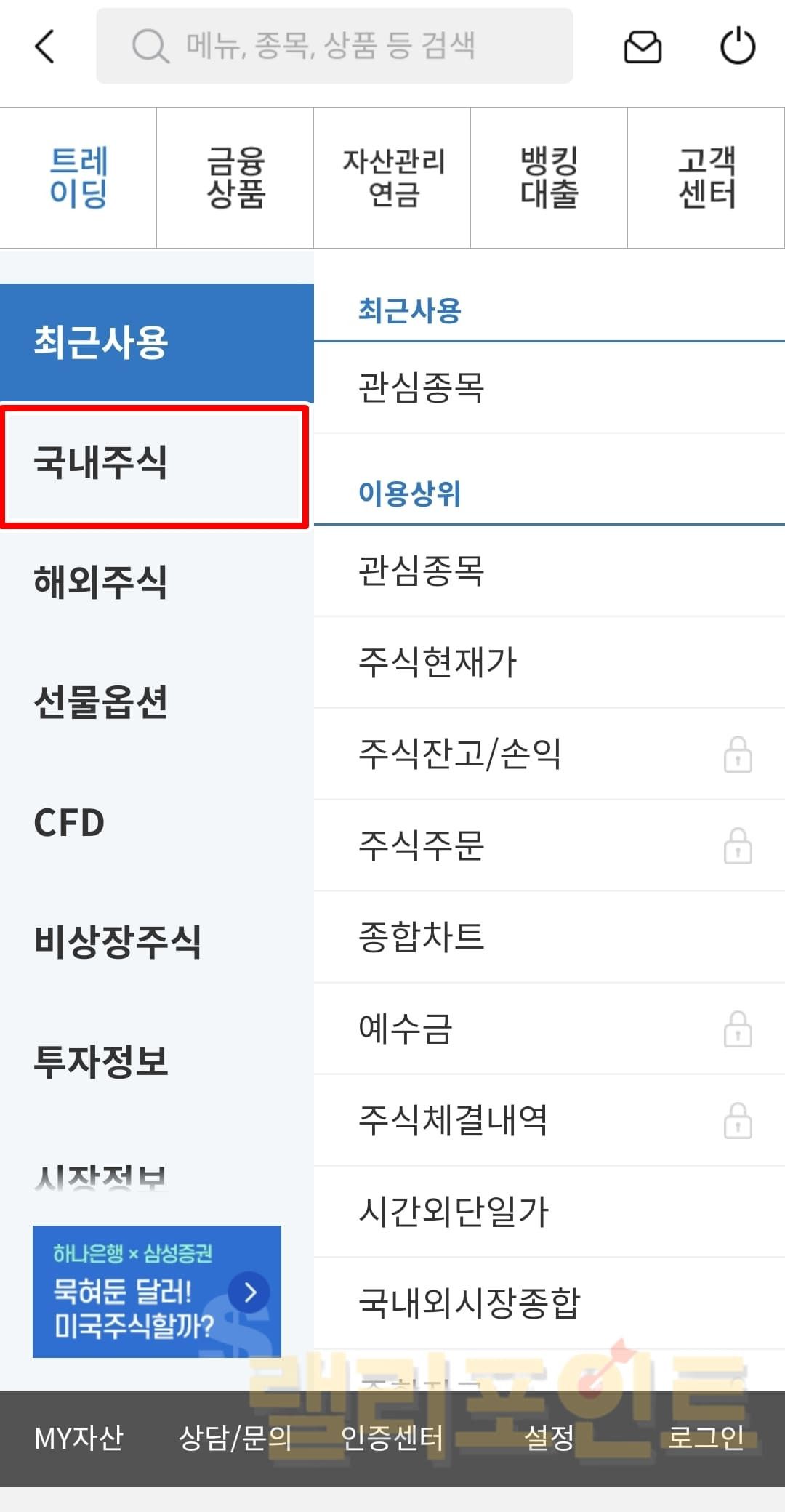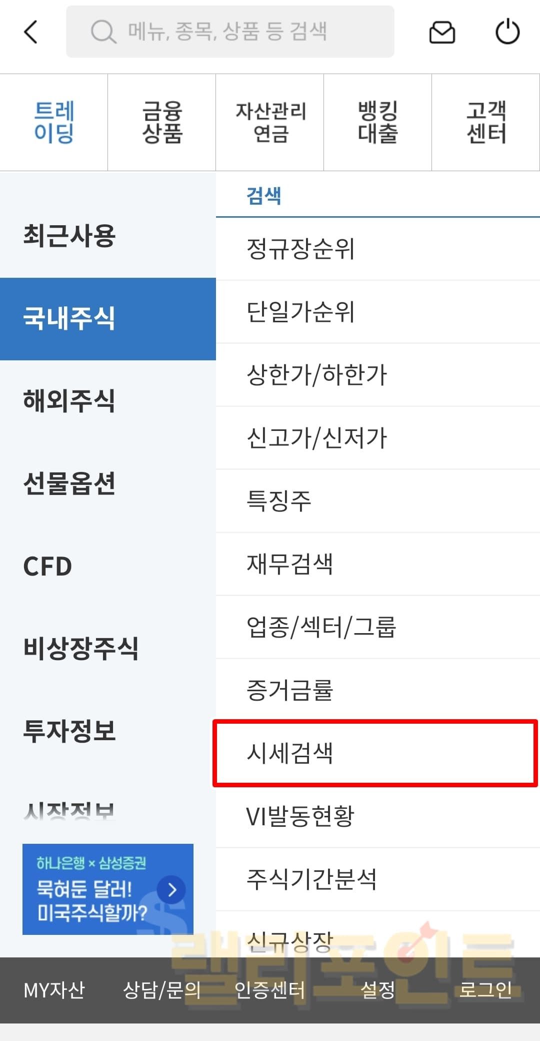 - 국내주식 메뉴에 있는 시세검색을 클릭합니다.