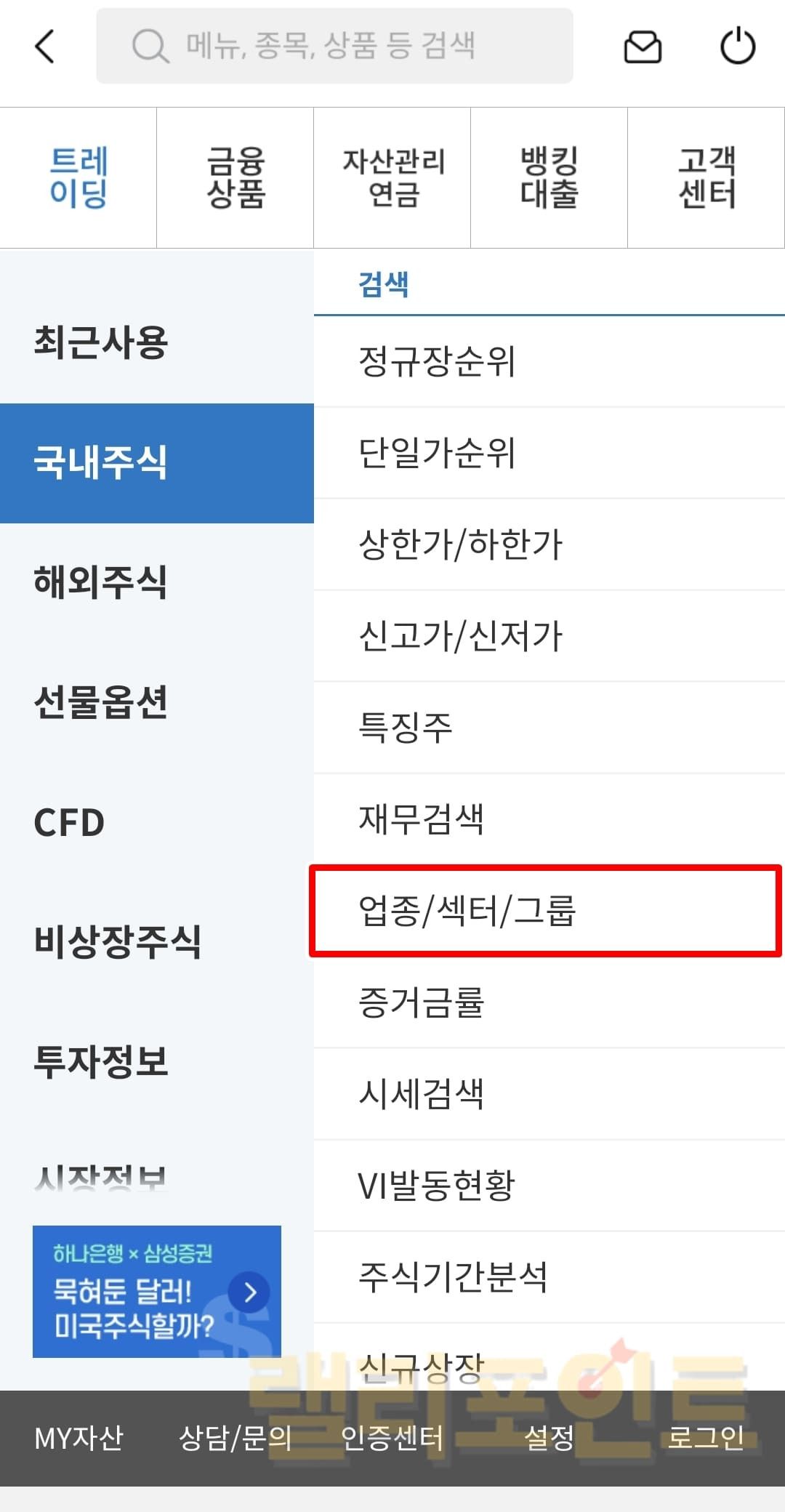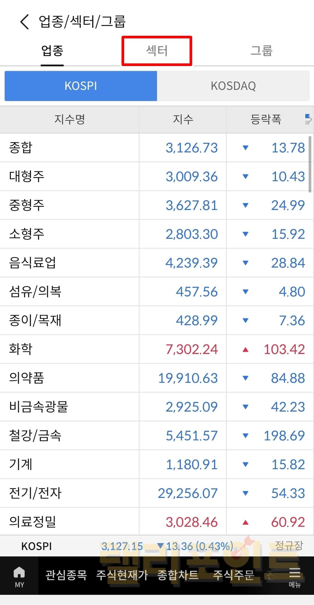 - 국내주식에서 업종/섹터/그룹을 클릭합니다.