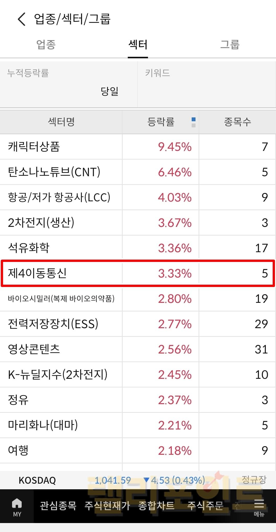 - 섹터에서 테마주들의 상승률을 볼 수 있습니다.