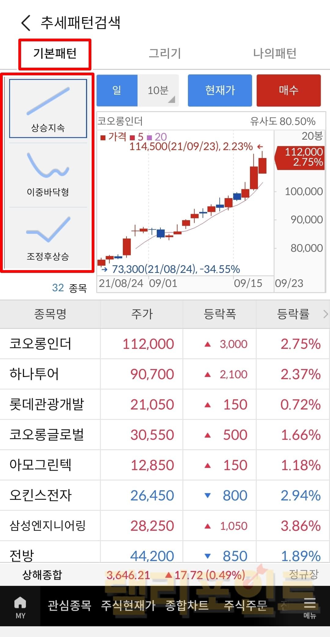 - 기본패턴에 포함된 당일 주식종목들을 확인할 수 있습니다.