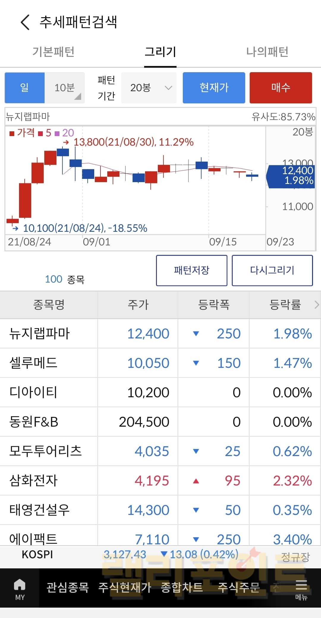 - 내가 그린 차트 모양과 유사한 종목 군의 리스트를 확인할 수 있습니다.