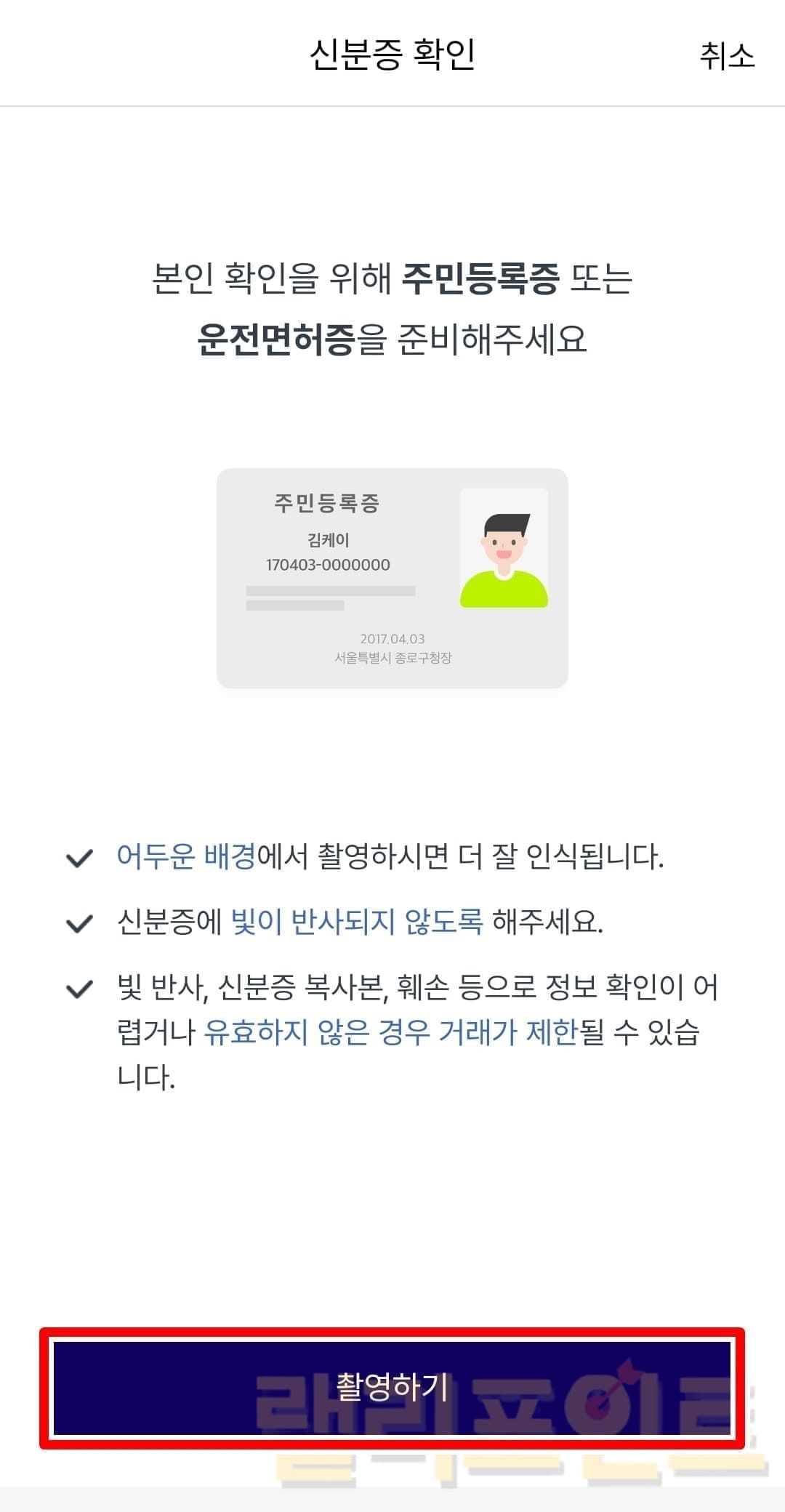 빛반사, 신분증 복사본, 훼손 등으로 정보 확인이 어렵거나 유효하지 않을 경우 거래가 제한될 수 있습니다.