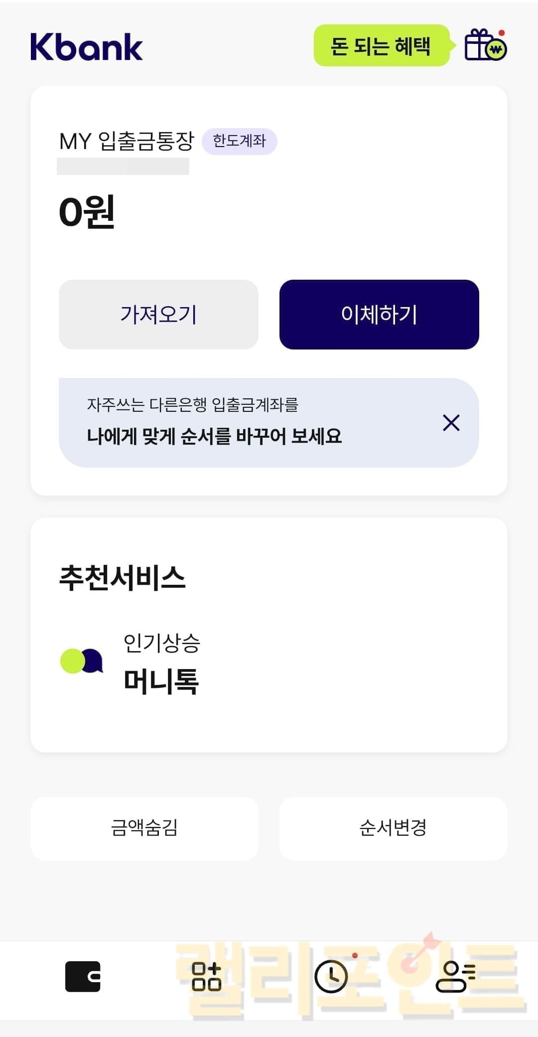 케이뱅크 어플 홈화면에서 개설된 입출금계좌를 확인할 수 있습니다. 참고로 케이뱅크 통장의 장점은 3가지가 있으니 참고하셔서 이용해보시길 바랍니다.