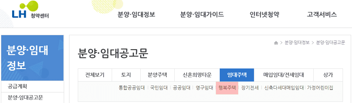 1. 임대주택 아래 탭에서 행복주택을 선택합니다.